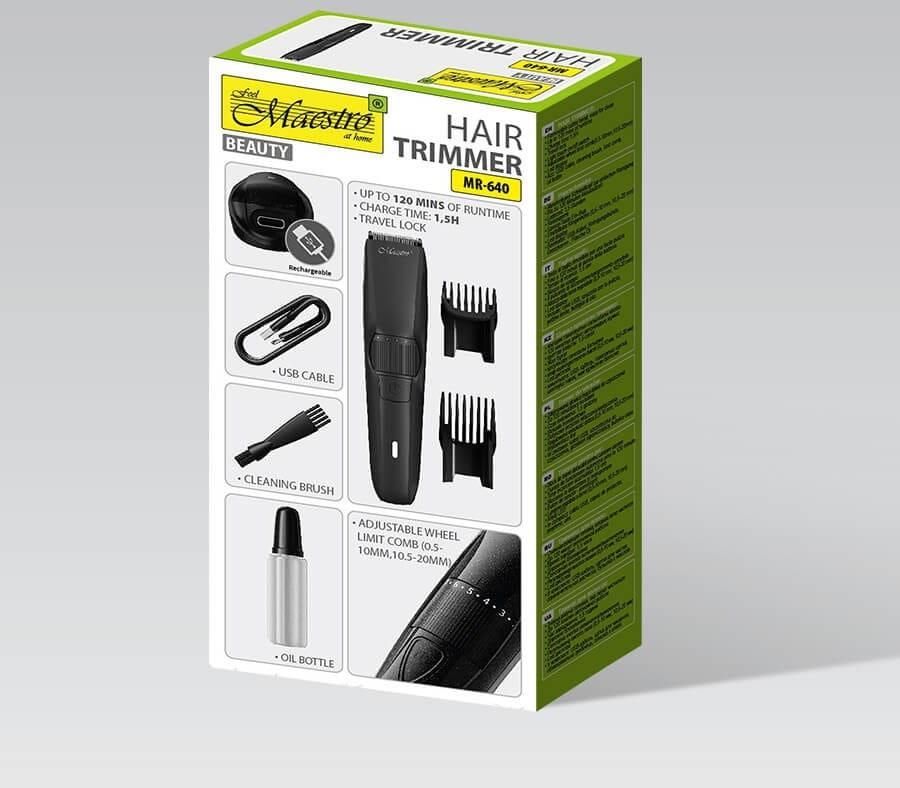 Trymer do włosów MR640 – Precyzja i Wygoda w Twoich Rękach! 🔥 Szukasz niezawodnej maszynki do strzyżenia, która zapewni Ci perfekcyjne cięcie i długą pracę na jednym ładowaniu? Trymer MR640 to idealny wybór! Nowoczesna i wydajna bateria litowa 3,7V 600 mAh – do 120 minut pracy po zaledwie 1,5 godziny ładowania! Regulowana wysokość ostrza (0,5-10 mm, 10,5-20 mm) – precyzyjna stylizacja na każdą okazję! Zdejmowana głowica tnąca – łatwe czyszczenie i dłuższa żywotność urządzenia! ? Blokada transportowa – bezpieczne przechowywanie, idealne w podróży! 👆 Dotykowy przycisk ON/OFF – nowoczesna i intuicyjna obsługa! 📟 Wyświetlacz LED – pełna kontrola nad poziomem baterii i ustawieniami! Zestaw zawiera Kabel USB do ładowania ? Szczoteczkę do czyszczenia 🧽 2 grzebienie (0,5-10 mm, 10,5-20 mm) Butelkę oleju do konserwacji Specyfikacja Bateria litowa: 3,7V 600 mAh Zdejmowana głowica tnąca łatwa do czyszczenia Do 120 minut pracy na baterii Czas ładowania: 1,5 godziny Blokada transportowa Dotykowy przycisk włączania/wyłączania Regulowana wysokość ostrza (0,5-10 mm, 10,5-20 mm) Wyświetlacz led Wszystkie produkty Feel Maestro at home są nie tylko piękne, ale też wygodne i funkcjonalne. Producent ceni sobie, szacunek jakim darzą go partnerzy i klienci. Stara się zawsze reagować na zmiany i potrzeby rynku i tworzyć modele produktów, które mogą zaspokoić najbardziej wymagających klientów. Produkty Feel Maestro są poszukiwane ze względu na ich ergonomię i funkcjonalność. Ważne jest, aby pamiętać, że produkty elektryczne, naczynia, akcesoria, porcelana, ceramika, a także szkło żaroodporne są w różnych kategoriach cenowych: ceny -. niskie, średnie i wysokie . Dzięki temu osoby na jakimkolwiek poziomie dochodów mogą sobie pozwolić na zakup towarów z wysokiej jakości materiałów. Feel Maestro dba o zdrowie i bezpieczeństwo, wszystkie produkty posiadają certyfikat marki.
