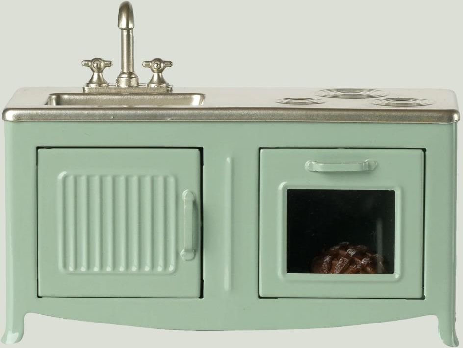 Sercem każdego domu jest kuchnia. Ta metalowa kuchnia ma piękną kolorystykę i wiele zabawnych detali, takich jak drzwiczki szafki, zlew i piekarnik ze świeżo upieczonym ciastem. Idealnie pasuje do mysiej rodziny. ROZMIARY Wysokość: 7,50 cm, Szerokość: 14,00 cm, Głębokość: 5,50 cm, Waga netto: 0,21 kg