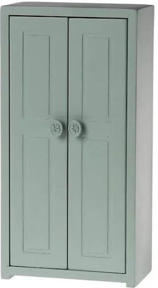 Błękitna szafa Maileg do przechowywania miniaturowych ubranek i akcesoriów. Elegancki design, solidne wykonanie, idealna do miniaturowych wnętrz.