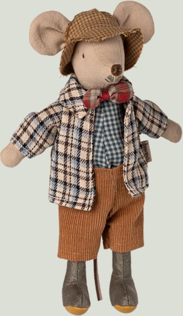 Maileg - Myszka dziadek Dziadek wygląda zarówno mądrze, jak i miło - nosi kalosze, muszkę, spodnie i kurtkę, a zawsze jest gotowy, aby rozweselić cię swoimi licznymi opowieściami. Myszka ma magnesy w swoich rączkach. Cechy produktu: Wysokość: 16.00 cm