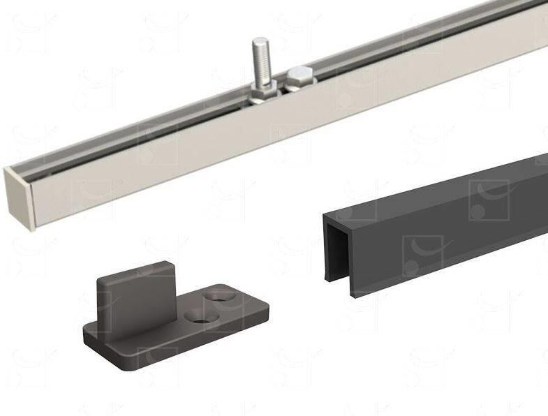 Podtynkowy zestaw montażowy do drzwi drewnianych systemu MOVENTIV 60. Zawiera: 1x aluminiowy profil górny 1500 mm + 2 zaślepki + elementy złączne; 1x dolny profil PVC 1500 mm + prowadnica. Masa 2,1 kg Cena za komplet.