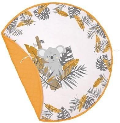 Mata do zabawy Nature & Love TROPICS Dwustronna Mata do zabawy i worek do zabawek w jednym - piękny produkt przydatny w każdym dziecięcym pokoiku. Przez pociągnięcie sznurków mata w kilka chwil zamienia się w worek na zabawki. Worek możemy zabrać ze sobą w podróż czy na wizytę do rodziny, wraz z zabawkowymi skarbami pociechy. Kolor: musztardowy, w połączeniu z nadrukiem misia koala i listków Wymiar: 150x150 cm (po rozłożeniu). Tkanina: produkt dwustronny: pikowana bawełna 100% / satyna - bawełna 100%, wypełnienia: antyalergiczna włóknina silikonowa (poliester 100%) Gatunek I, wyprodukowana w Polsce. Ze względu na użyte sznurki, produkt po zwinięciu w worek na zabawki, nie powinien pozostawać w widocznym miejscu, bez nadzoru dorosłego Producent informuje, że pokazana na zdjęciu kolorystyka może nieznacznie różnić się od rzeczywistego produktu Stosowany nadruk jest ekologiczny – najlepszy dla tkanin wykorzystywanych w produktach dziecięcych, może jednak delikatnie blaknąć podczas prania.