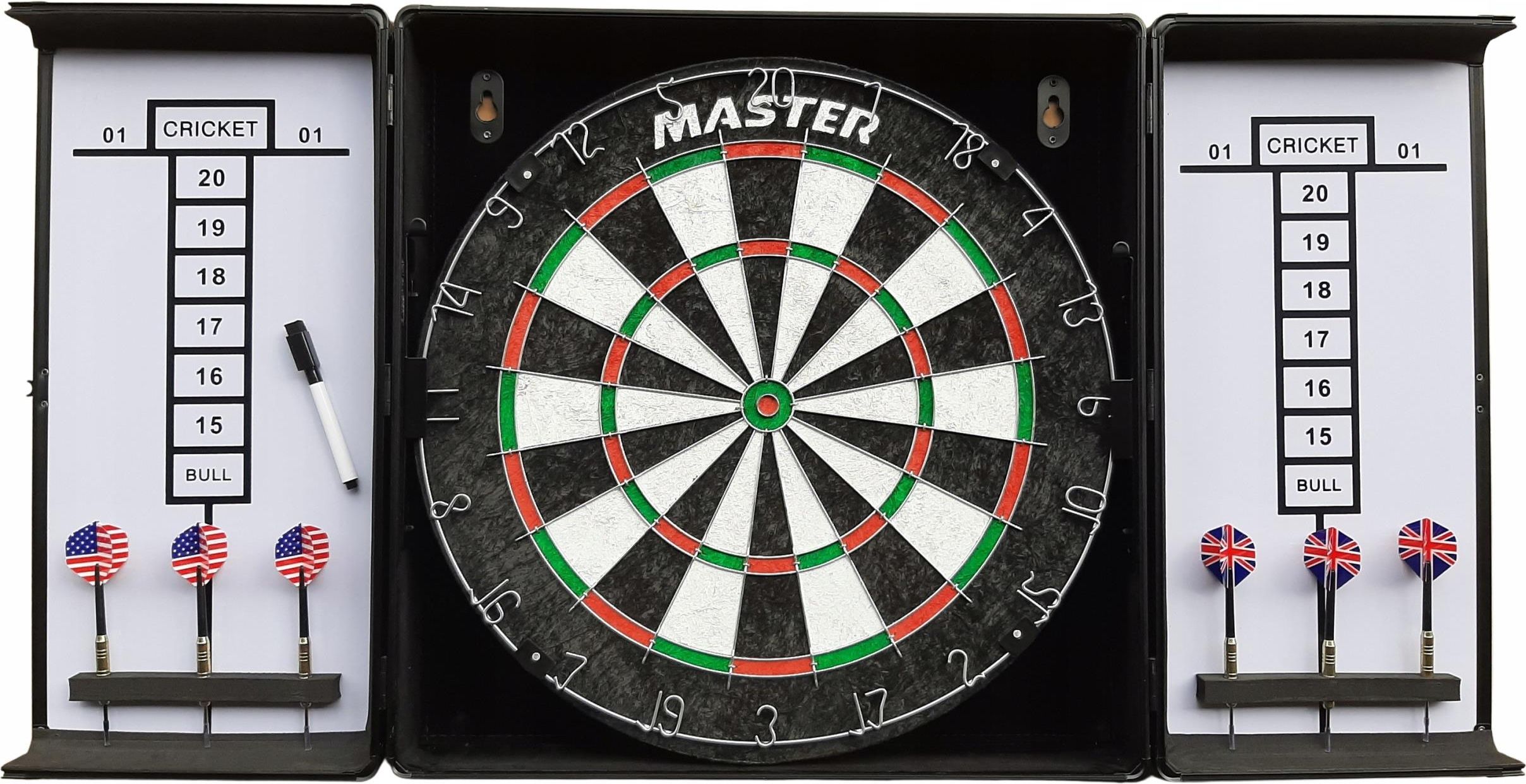 Oryginalny produkt marki MASTER Aluminiowa Szafka z Tarczą MASTER i Rzutkami - to zestaw, który zawiera aluminiową szafkę z tablicą wyników (wewnątrz drzwi), wysokiej jakości tarczę sizalową o średnicy 45 cm, 2 zestawy mosiężnych rzutek (tj. 6 szt.) i marker do zapisywania wyników. Tarcza sizalowa …