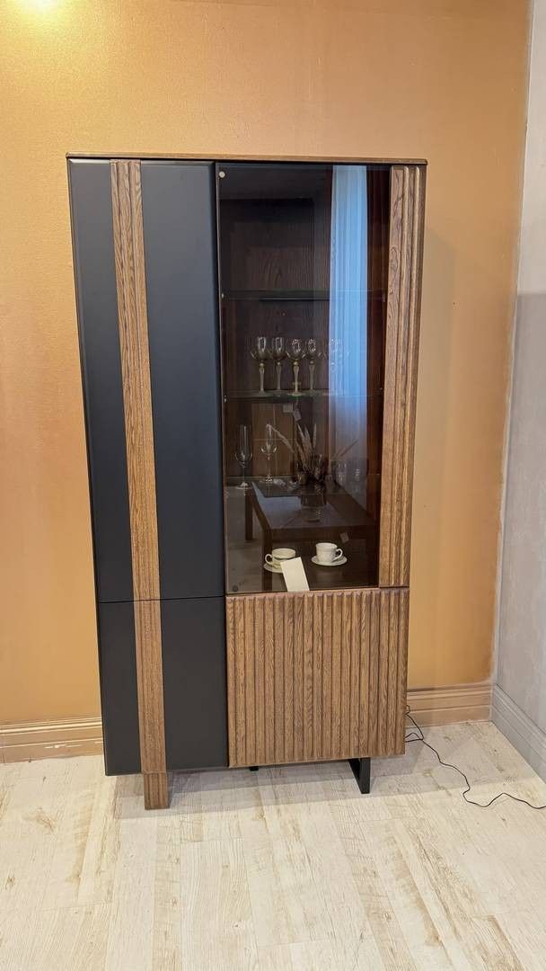 Witryna dla osób, które chcą połączyć efektowną ekspozycję z zamkniętą przestrzenią do przechowywania i zależy im na wyrazistym, nowoczesnym designie. Najważniejsze cechy witryna stojąca z kolekcji ISLA fronty wykonane z litego dębu i MDF-u frezowane, pionowe elementy dekoracyjne na frontach korpus wykończony naturalną okleiną (fornir) przeszklona część ekspozycyjna z oświetleniem LED 3 szklane półki do ekspozycji szkła lub dekoracji połączenie witryny i zamkniętej szafki stabilna konstrukcja na nogach w czarnym wykończeniu Wymiary szerokość: 102 cm głębokość: 40 cm wysokość: 204 cm Opis produktuWitryna ISLA została zaprojektowana z myślą o eleganckich, współczesnych wnętrzach. Frezowane fronty nadają bryle wyrazistego charakteru, a naturalne materiały wprowadzają do przestrzeni ciepło i równowagę. Przeszklona część z oświetleniem LED pozwala efektownie wyeksponować szkło, porcelanę lub dekoracje, natomiast pełne fronty po lewej stronie zapewniają dyskretne miejsce na przedmioty, które chcesz schować. Smukłe proporcje sprawiają, że mimo dużej pojemności witryna prezentuje się lekko i elegancko. Dlaczego warto połączenie ekspozycji i przechowywania w jednym meblu frezowane fronty wyróżniają witrynę na tle prostych form oświetlenie LED w standardzie – gotowa do aranżacji duża pojemność przy zachowaniu zgrabnej sylwetki idealna do nowoczesnych i loftowych wnętrz Masz pytania? Zadzwoń: 668 558 242 – chętnie doradzimy.Witryna dostępna do obejrzenia na żywo w naszym salonie meblowym w Cierpicach koło Torunia.