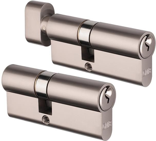 Komplet 2 ujednoliconych wkładek Gałka zawsze od strony pierwszego wymiaru Do zamków wpuszczanych. Klasyfikacja EN 1303: 1 6 0 0 0 C 5 0 6 kluczy w zestawie Dostępne rozmiary: 30/30 - 50/60 mm