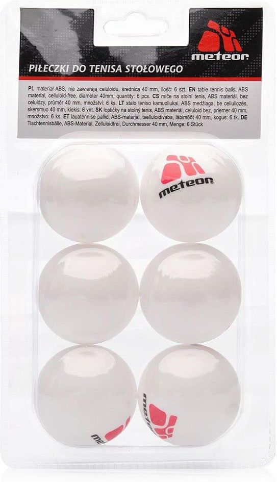 Zestaw 6 piłeczek do ping ponga Meteor białe 15028 Właściwości Rozegraj energiczny mecz i wygraj każdy set, zaskakując przeciwnika swoimi umiejętnościami i dobrym opanowaniem piłeczki do ping ponga. Piłki treningowe Meteor spełnią oczekiwania najbardziej wymagających graczy, którzy poszukują sprawdzonych piłeczek do tenisa stołowego. Wykorzystanie nowoczesnych technologii i najwyższej jakości ABSu. Dobre cechy rotacyjne i ultraszybki lot. Komplet zawiera 6 sztuk białych piłeczek z logo Meteor. Dane techniczne:· średnica: 40 mm· ilość: 6 sztuk· materiał: tworzywo sztuczne (ABS) · kolor: biały
