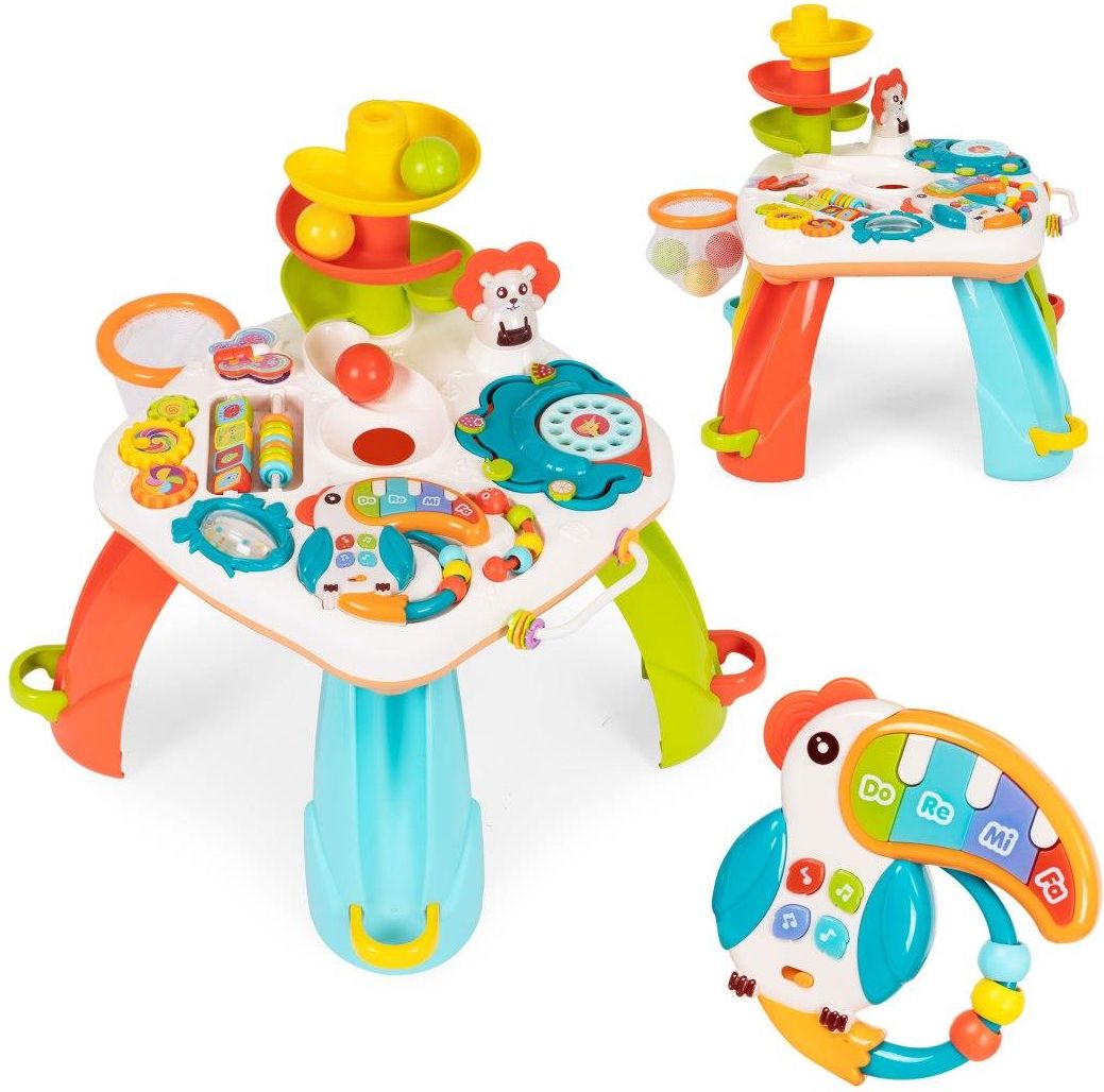 STOLIK EDUKACYJNY DLA DZIECI Dla dzieci od 18 miesiąca życia Zjeżdżalnia na kolorowe piłeczki Interaktywny "tukan" - pianinko z melodiami Odpinany kosz na piłeczki Tarcza telefoniczna z numerkami Odczepiana zabawka Obracana grzechotka z kolorowymi kuleczkami Liczne koraliki do przesuwania …
