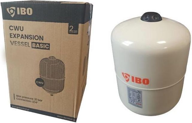 Naczynie przeponowe wzbiorcze do instalacji CWU 12L IBO BASIC Wysokiej jakości naczynie przeponowe C.W.U. BASIC o pojemności 12L to niezawodne rozwiązanie do instalacji ciepłej i zimnej wody użytkowej. Wykonane z grubej stali węglowej, pokryte specjalnym lakierem antykorozyjnym, gwarantują trwałość i odporność na trudne warunki eksploatacyjne. Cechy Produktu Wysoka jakość materiałów: Naczynia wykonane z wytrzymałej stali węglowej, zapewniającej długą żywotność produktu. Przepona butylowa: Wewnętrzna przepona oddziela wodę od powietrza, co stabilizuje ciśnienie w instalacji. Zawór do regulacji powietrza: Wentyl identyczny jak w kołach samochodowych, umożliwiający dopompowanie lub spuszczanie powietrza, umieszczony w tylnej części naczynia pod pokrywą. Powłoka Epoksydowa: Zewnętrzna powierzchnia pokryta farbą epoksydową w proszku, która dodatkowo chroni naczynie przed korozją. Zastosowanie Idealne do instalacji wody ciepłej oraz zimnej przeznaczonej do spożycia, gdzie konieczne jest utrzymanie oraz wyrównywanie ciśnienia wynikającego ze zmian objętości wody. Zgodność z Normami Naczynia przeponowe IBO spełniają wymagania dyrektywy 2014/68/EU, co potwierdza ich wysoką jakość i bezpieczeństwo użytkowania. Dodatkowe Informacje Nadają się do stosowania z mieszaninami glikolu etylenowego lub propylenowego, a także charakteryzują się bardzo niską przepuszczalnością gazu. Dane techniczne Maksymalne ciśnienie robocze: 10 bar Maksymalne ciśnienie testowe: 15 bar Ciśnienie wstępne: 3,5 +/- 10% Temperatura robocza: 0-100C Przyłącze: GZ 3/4" Pojemność: 12 litrów Wymiary: 28x32 cm