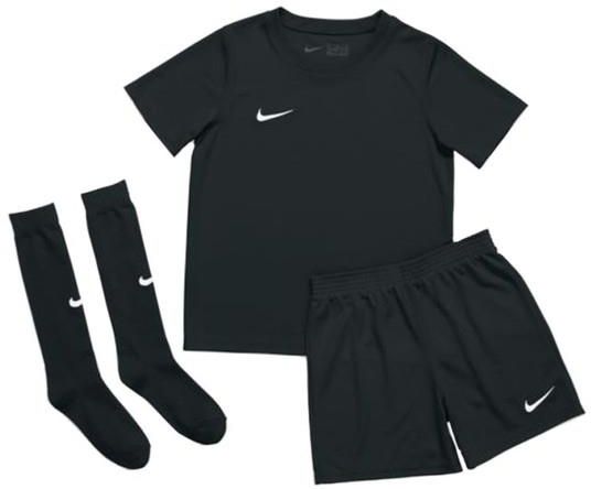 Komplet dla dzieci Nike obejmujący koszulkę, spodenki i getry to jeden z podstawowych elementów szkolnej wyprawki dla każdego ucznia. Fason w czarnej odsłonie tworzy funkcjonalny stój na sportowe zajęcia czy spontaniczne rozgrywki z rówieśnikami. Kontrastowe logo brandu podkreśla wysoką jakość wykonania jaką niesie ze sobą produkt marki Nike. Wspierająca technologia Dri-FIT szybko i sprawnie odprowadza wilgoć z powierzchni skóry, oferując nieprzerwany komfort i przyjemne uczucie świeżości, nawet podczas ekstremalnie wymagającej aktywności. Siateczkowy panel znajdujący się w elastycznym pasie spodenek oraz w tylnej części koszulki zwiększa naturalną przewiewność i właściwości oddychające. Tradycyjny krój jest gwarancją wygody i niczym nieograniczonej swobody ruchów. Sięgając po komplet, w produkcji którego wykorzystano poliester z recyklingu, dodatkowo przyczyniasz się do ochrony naturalnych zasobów środowiska. Materiał: 100% poliester z recyklingu (koszulka i spodenki ); 71% nylon 26% poliester 3% elastan (getry)