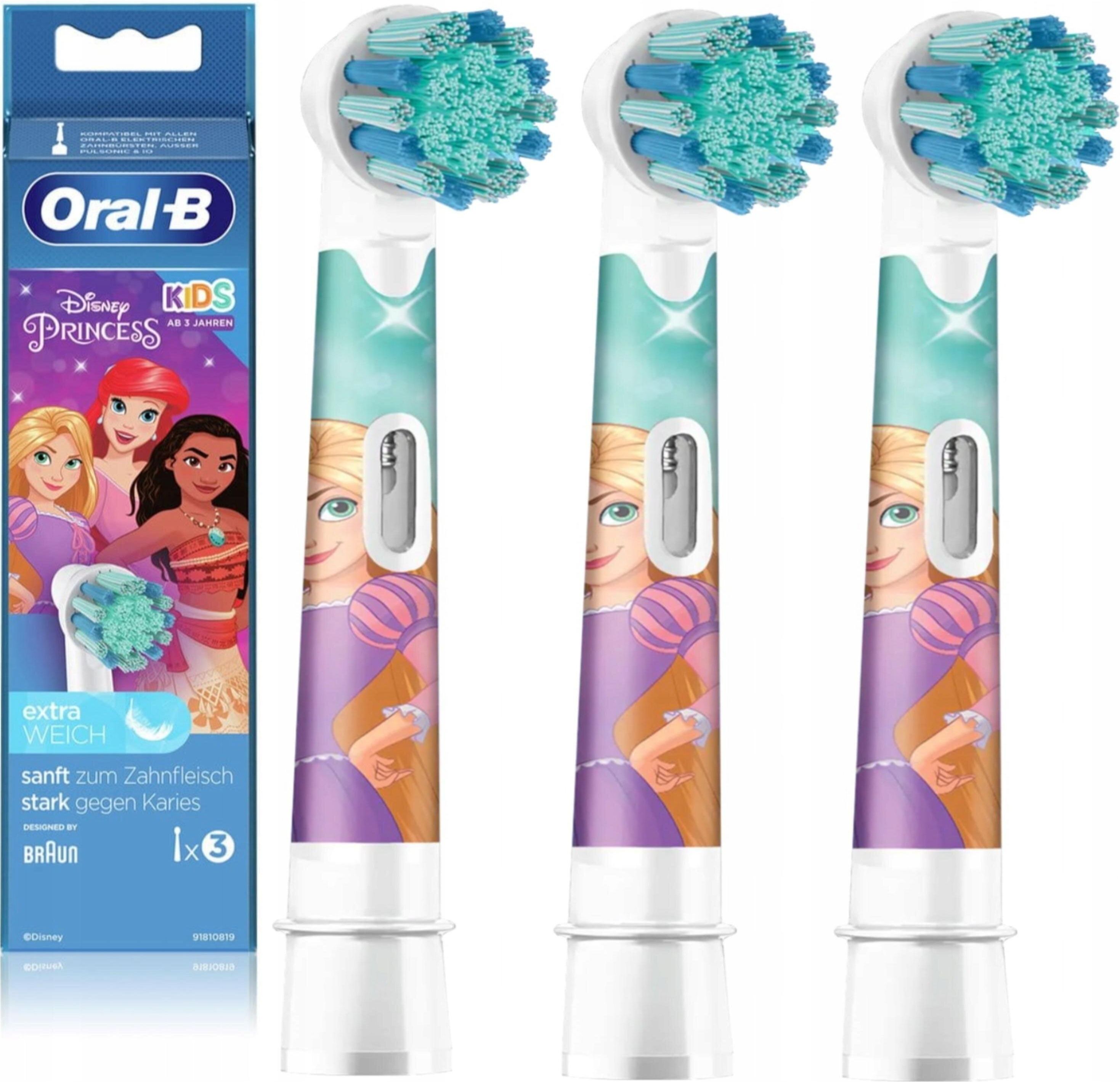 Oral-B Końcówka Kids Princess EB10S-3 3szt. Końcówka do szczoteczek elektrycznych Oral-B Kids 3+ nie tylko zapewnia dzieciom delikatne i skuteczne czyszczenie zębów rekomendowaną przez dentystów szczoteczką Oral-B.. Wyjątkowo miękkie włókna i mała okrągła końcówka zostały zaprojektowane specjalnie dla dzieci i są kompatybilne ze wszystkimi szczoteczkami elektrycznymi Oral-B Kids. Usuwa do 100% więcej płytki bakteryjnej, dbając o zdrowie dziąseł Okrągła główka szczoteczki otacza każdy ząb, łatwiej docierając do przestrzeni międzyzębowych, i usuwając do 100% więcej płytki bakteryjnej w porównaniu ze szczoteczką manualną. Włókna w kształcie litery X usuwają więcej płytki Końcówki szczoteczek Oral-B są wyposażone w włókna w kształcie litery X, które – jak udowodniono klinicznie – dostosowują się i docierają do wszystkich powierzchni zębów, usuwając płytkę bakteryjną, do której zwykłe włókna nie dosięgają. Tym samym zapewniają lepsze, dokładniejsze czyszczenie Delikatne dla dziąseł Technologia Oral-B łączy różne rodzaje włókien, zapewniając wyjątkową pielęgnację dziąseł i delikatne czyszczenie, aby szczotkowanie zębów było jeszcze przyjemniejsze Wskaźnik zużycia końcówki szczoteczki Dentyści zalecają wymianę końcówki szczoteczki co 3 miesiące, aby zapewnić 100% skuteczności czyszczenia. Końcówki szczoteczek Oral-B są wyposażone w technologię wskaźnika zużycia włókien, która wskazuje czas wymiany na podstawie indywidualnego stylu szczotkowania zębów 78% biopochodnych tworzyw sztucznych Aby zmniejszyć ilość surowców kopalnych i nasz wpływ na środowisko, do produkcji końcówek szczoteczek użyto biopochodnych tworzyw sztucznych. Jeszcze nie wszystkie tworzywa sztuczne można przekształcić w biopochodną alternatywę bilansu masowego, ponieważ nadal marka Oral-B potrzebuje specjalnych materiałów, które pozwalają zapewnić wysoką wydajność i jakość końcówek do szczoteczek