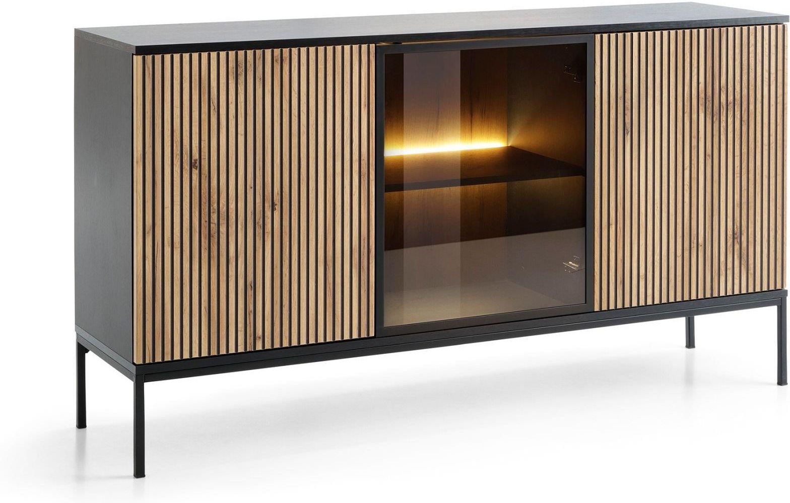Komoda Trzydrzwiowa Ryflowana Szkło+LED Dąb Wotan/Czarny 154x39x83 cm SENTO KOMODA LED Kolekcja mebli SENTO Komoda Sento to połączenie minimalistycznej formy z eleganckim charakterem. Jej nowoczesny design podkreśla zestawienie czerni z ciepłym odcieniem dębu wotan a pionowe ryflowania tworzą …