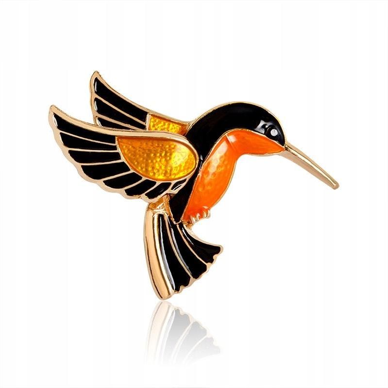 Przypinka PINETS z kolekcji Nature Przypinka Koliberek Nr katalogowy: B120 Specyfikacja: Szerokość: 4,5cm Wysokość: 3,2cm Kolor: złoty, czarny Materiał: metal odlewany bez zawartości niklu Zdobienia: emaliowany