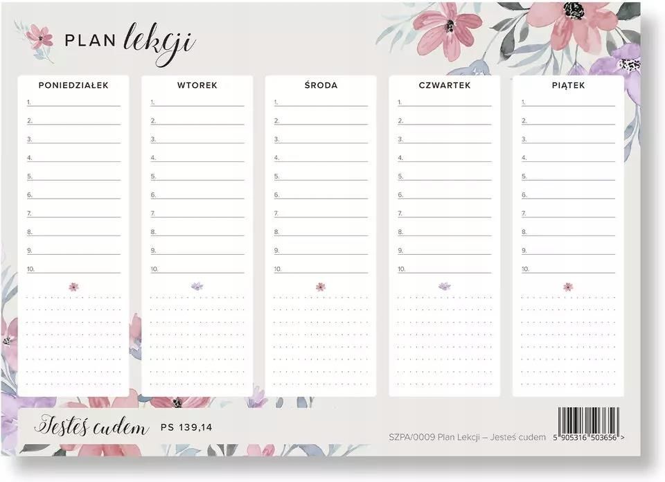Plan Lekcji - Jesteś cudem Pozwól, aby chrześcijański plan lekcji „Jesteś Cudem” dodał Ci inspiracji i organizacji na każdy dzień tygodnia.Wykonany z najwyższej jakości kartonu o gramaturze 250 g, ten plan lekcji jest nie tylko trwały, ale również niezwykle estetyczny. Plan lekcji ma format A5. Delikatne, pastelowe kwiaty, które zdobią ten plan, wprowadzają uśmiech do codziennego życia. Na dole widnieje fragment Psalmu 139,14 „Jesteś cudem”, który przypomina o wyjątkowości każdego człowieka i Bożej miłości.To doskonały wybór dla osób, które pragną czerpać inspirację z Pisma Świętego, jednocześnie utrzymując swoje codzienne obowiązki w porządku. Pozwól, aby chrześcijański plan lekcji „Jesteś Cudem” dodał Ci inspiracji i organizacji na każdy dzień tygodnia.Wykonany z najwyższej jakości kartonu o gramaturze 250 g, ten plan lekcji jest nie tylko trwały, ale również niezwykle estetyczny. Plan lekcji ma format A5. Delikatne, pastelowe kwiaty, które zdobią ten plan, wprowadzają uśmiech do codziennego życia. Na dole widnieje fragment Psalmu 139,14 „Jesteś cudem”, który przypomina o wyjątkowości każdego człowieka i Bożej miłości.To doskonały wybór dla osób, które pragną czerpać inspirację z Pisma Świętego, jednocześnie utrzymując swoje codzienne obowiązki w porządku.