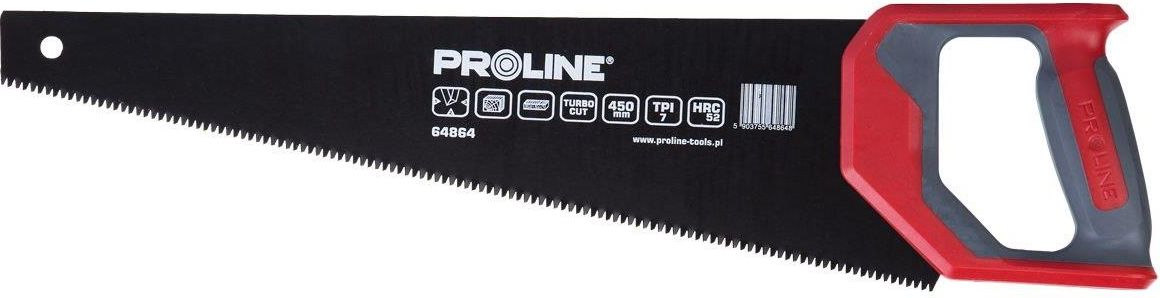 Uzębienie agresywne z 3 szlifowanymi krawędziami tnącymi do szybkiego cięcia Dwuskładnikowa rękojeść z tworzywa z wkładką antypoślizgową Pokrywana teflonem dająca małe opory w czasie cięcia Do cięcia zgrubnego drewna i płyty wiórowej Pliki: 64863.pdf Parametry: Marka: PROLINE
