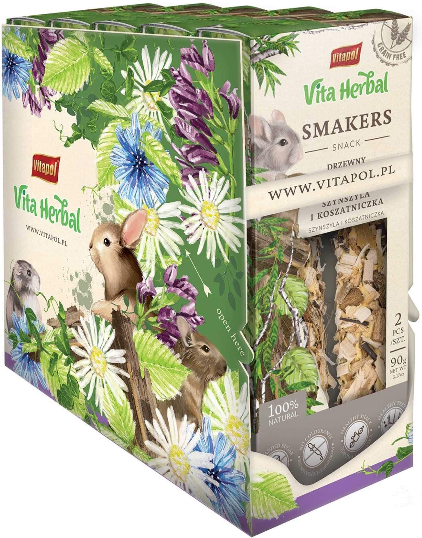Zestaw Smakersów drzewnych dla szynszyli i koszatniczki Producent: Vitapol | Naturalny gryzak | Wspomaga ścieranie siekaczy | Bez dodatku cukrów | 5 x 90 g Opis produktu: Spraw przyjemność swojej szynszyli lub koszatniczce i podaruj jej pyszną i zdrową przekąskę drzewną ✅ Smakers drzewny - zdrowa przekąska ✅ Skład w 100% naturalny (kora i gałązki) ✅ Wspomaga ścieranie siekaczy ✅ Bez cukrów i sztucznych barwników ✅ Pozytywnie wpływa na układ trawienny ✅ Duża zawartość włókna ✅ Doskonałe źródło witamin i minerałów ✅ Świetne uzupełnienie codziennej diety ✅ W tej cenie - aż 5 x 90 g Smakersów Postaw na posiłek z Vitapol Jedzenie to jedna z najważniejszych czynności w życiu każdego małego zwierzaka, dlatego warto jest zatroszczyć się o to, co spożywa nasza koszatniczka lub szynszyla. Oprócz odpowiednio dobranej karmy pełnoporcjowej dobrej jakości, istotnym elementem w diecie gryzoni są różnego rodzaju karmy uzupełniające, dlatego przy ich doborze warto jest zwrócić szczególną uwagę na ich skład. Ważne jest, aby przysmaki które podajemy naszym małym pupilom były naturalnego pochodzenia i nie zawierały sztucznych dodatków. W przypadku szynszyli i koszatniczek istotne jest, aby przekąski nie zawierały dodatku cukrów, miodu lub innych składników o wysokim współczynniku gimnicznym. Skład produktu: mączka z lucerny, mąka grochowa, kora bukowa suszona (15,5%), kora wierzby suszona (12%), gałązki brzozy suszone (12%), łupina kokosowa suszona, kora cynamonu. Składniki analityczne: ✅ białko surowe (ozn. Met. Kjeldahla) min. 12,2% ✅ tłuszcz surowy min. 0% ✅ włókno surowe max. 13,86% ✅ popiół surowy max. 18,9% ✅ fosfor min. 0,05% ✅ fosfor max. 0,65% ✅ wapń min. 0,07% ✅ wapń max. 0,97% ✅ wilgotność max. 12% Galeria zdjęć