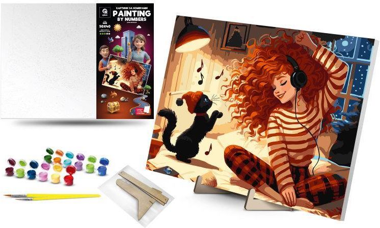 Malowanie po numerach Szczęśliwi miłośnicy muzyki 40x50 cm Qbee ✅ ✔️ Zestaw do malowania po numerach składa się z zagruntowanego płótna artystycznego na blejtramie, zestawu wysokiej jakości farb akrylowych odpornych na ścieranie i przypalanie o pojemności 2,5 ml 9% każda, nylonowych pędzli różnej …