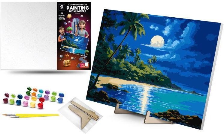 Malowanie po numerach Światło Księżyca 40x50 cm Qbee ✅ ✔️ Zestaw do malowania po numerach składa się z zagruntowanego płótna artystycznego na blejtramie, zestawu wysokiej jakości farb akrylowych odpornych na ścieranie i przypalanie o pojemności 2,5 ml 9% każda, nylonowych pędzli różnej wielkości, …
