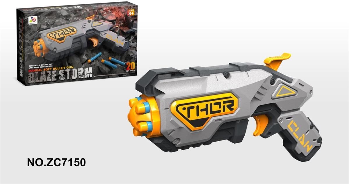 Opis Blaze Storm Pistolet Szary Manulany Krótki manualny pistolet Blaze Storm to propozycja dla dzieci od 8-go roku życia. Zabawkowa broń wyposażona została w mechanizm sprężynowy i nie wymaga zastosowania baterii. Obsługa pistoletu jest bardzo prosta, wystarczy załadować strzałki z przody pistoletu, nacisnąć mechanizm sprężynowy (żółta wajcha w górnej tylnej części) i nacisnąć spust. Zabawkowy pistolet dla dzieci jest bezpieczny, pociski wykonane są z miękkiej pianki zakończonej gumą. W zestawie znajduje się 20 pocisków (10 z gumowymi końcami i 10 z gumowymi przyssawkami). Specyfikacja: - poręczny nieduży pistolet, - typ karabinku wyrzutnia sprężynowa, manualna, - tryb ładowania przód, - magazynek zmieści 5 pocisków, - wystrzał pojedynczy. Wymiary - pistolet ok. 28,5 cm x 16,5 cm x 6 cm, - opakowanie ok. 32,5 cm x 20,5 cm x 8 cm. Zawartość zestawu - pistolet Blaze Storm szary, - 10 pocisków z gumowym zakończeniem, - 10 pocisków z gumową przyssawką.