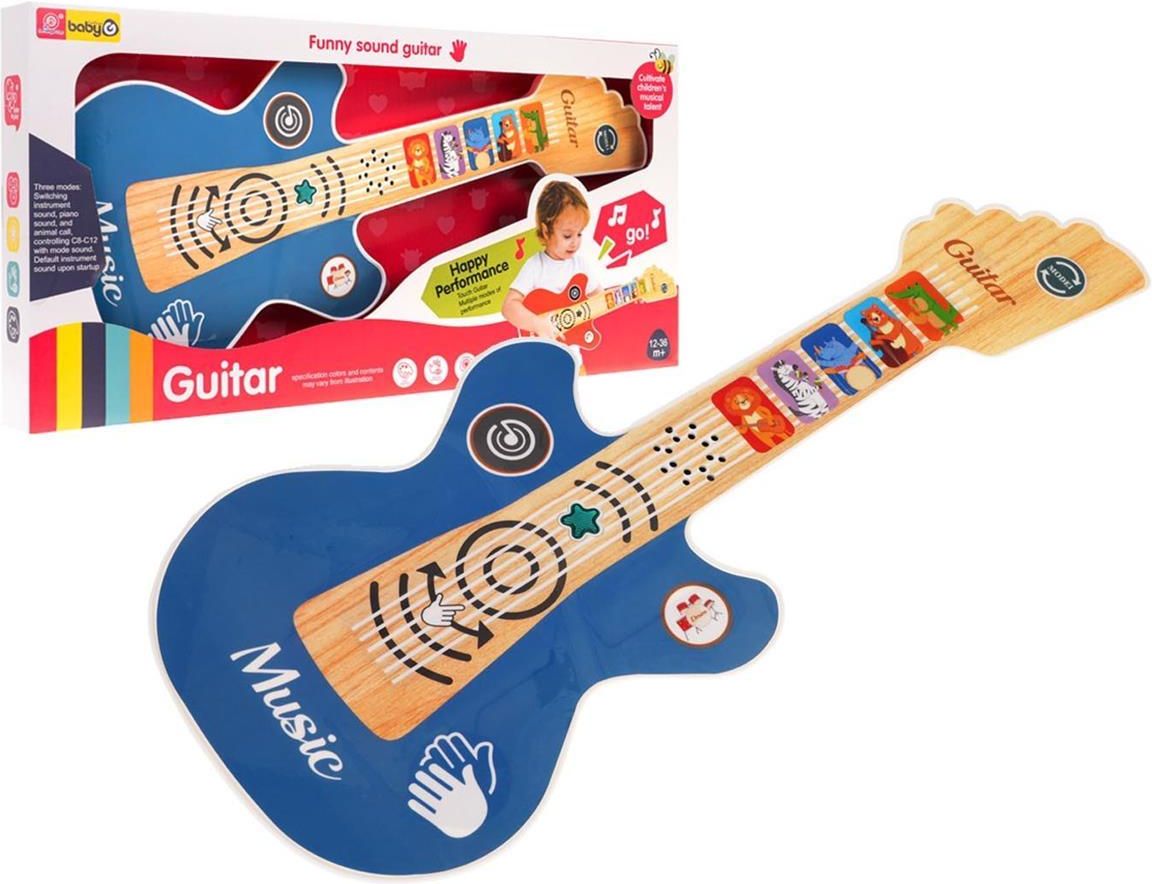 Opis Gitara Dla Najmłodszych z Funkcją Świateł Gitara elektryczna dla dzieci powyżej 12-go miesiąca życia. Gitara wykonana została z najlepszej jakości materiałów, jest lekka i kolorowa. Maluszek ma do dyspozycji 11 różnych melodii (przycisk dotykowy z nutką), 2 podkłady z perkusją (przycisk dotykowy z perkusją) oraz odgłosy braw (przycisk dotykowy z rączkami). Na górze gitary znajduje się okrągły przycisk dotykowy zmieniający funkcje przycisków dotykowych ze zwierzątkami (lew, zebra, hipopotam, miś oraz krokodyl) W trybie pierwszym słyszymy dźwięki gitary, perkusji, skrzypiec czy saksofonu. W kolejnym trybie naciskając na zwierzątka możemy zagrać do-re-mi-fa-sol, a jeszcze w następnym usłyszymy odgłosy zwierzątek. Po naciśnięciu jakiegokolwiek z przycisków dotykowych mruga gwiazdka znajdująca się na środku gitary. Zabawka zasilana jest bateriami typu 3 x AA 1,5 V (brak w zestawie). Funkcje gitary odpowiednia dla dzieci powyżej 12-go miesiąca życia, wykonana z najlepszej jakości materiałów, przycisk z nutą odtwarza 11 melodii, przycisk z perkusją odtwarza 2 podkłady z perkusją, przycisk z rączkami odtwarza brawa, przyciski ze zwierzątkami (melodie, odgłosy instrumentów, odgłosy zwierząt), przycisk ze zmianą funkcji przycisków ze zwierzątkami) mrugająca gwiazdka, regulacja głośności. Wymiary - gitara ok.46,5 cm x 17,5 cm x 3 cm, - opakowanie ok. 48,5 cm x 24 cm x 5 cm. Zawartość zestawu - gitara elektryczna.