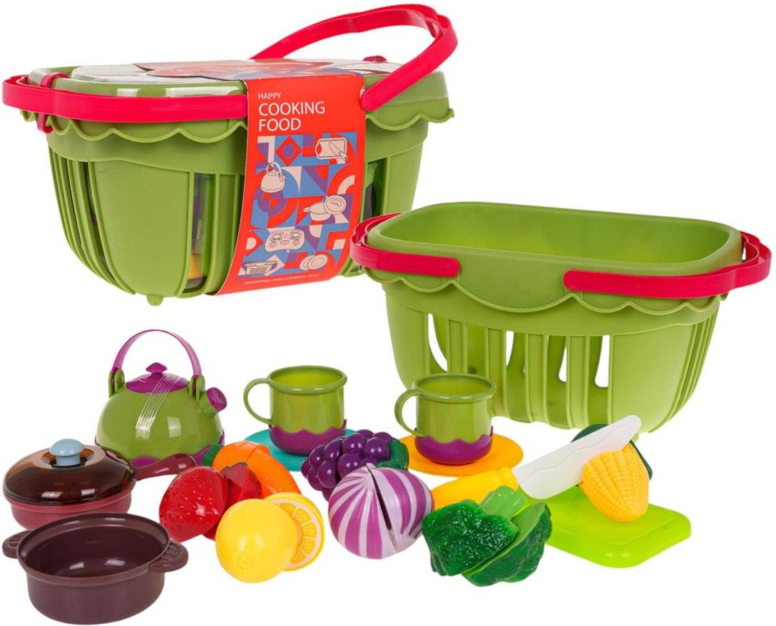 Opis Koszyk Na Piknik Warzywa + Owoce Koszyk z akcesoriami dla dzieci od 3-go roku życia. W zestawie znajduje się koszyk piknikowy, garnek z pokrywką, deska do krojenia warzyw i owoców, nóż, patelnia, talerzyki, kubki oraz atrapy warzyw i owoców na rzepy. Idealny sposób na zabawę na zewnątrz. Funkcje zestawu przeznaczony jest dla dzieci od 3-go roku życia, znakomicie wykonany w żywych kolorach przyciągających wzrok dziecka, liczne akcesoria w zestawie, idealny sposób na zabawę na zewnątrz. Wymiary koszyk piknikowy ok. 29 cm x 18 cm x 13,5 cm, deska do krojenia ok. 13,5 cm x 7,5 cm x 1 cm, garnek z pokrywką ok. 5,5 cm x 10 cm x 7 cm, nóż ok. 13 cm x 3 cm, talerzyk ok. 9 cm średnicy, kubek ok. 5 cm x 7 cm, czajnik ok. 9 cm x 8,5 cm, patelnia ok. 11,5 cm x 7,5 cm x 2 cm, kukurydza ok. 8,5 cm x 5 cm truskawka ok. 5,5 cm x 5 cm, winogrono ok. 7,5 cm x 4,5 cm, -marchewka ok. 8,5 cm x 4 cm, cytryna ok. 6,5 cm x 4 cm, brokuł ok. 6 cm x 5 cm, czosnek ok. 5,5 cm x 6 cm, opakowanie ok. 29 cm x 18 cm x 13,5 cm. Zawartość zestawu koszyk piknikowy, deska do krojenia, garnek z pokrywką, nóż, patelnia, 2 x kubek, czajnik, atrapy owoców na rzepy: cytryna, truskawka, winogrono, atrapy warzyw na rzepy: brokuł, kukurydza, marchew i czosnek. 2 x talerzyk.