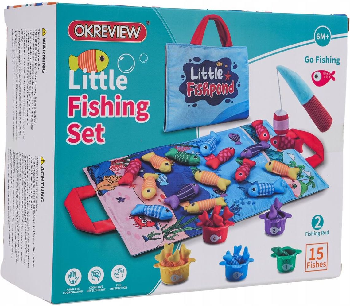 Opis Miękki Zestaw Do Łowienia Rybek Miękki sensoryczny zestaw do łowienia rybek dla maluszków od szóstego miesiąca życia. Zestaw wykonany został z materiałów bezpiecznych dla dzieci w żywych kolorach, stymuluje dziecko na wielu płaszczyznach. Żywe kolory przyciągają uwagę dziecka i zachęcają do chwytania i zabawy. Na zestaw składają się: materiałowa mata z rysunkiem przedstawiającym morze i zwierzątka morskie, 15 miękkich kolorowych rybek, 5 kubeczków oraz wędka na rzepy. Rybki są w 5 wersjach kolorystycznych tak jak kubeczki. Na kubeczkach znajdują się numerki od 1 do 5. Maluszek musi złowić rybkę i włożyć ją do konkretnego kubeczka pasującego kolorem do koloru rybki. Liczba rybek w kubeczku powinna być zgodna z numerkiem na kubku. Mata posiada wszyte 2 rączki do przenoszenia, można włożyć do jej środka wszystkie elementy zestawu i zabrać je wszędzie ze sobą. Z tym zestawem maluszek ćwiczy koordynację ręka-oko, stymuluje wzrok, dotyk, precyzję. Poznaje kształty, kolory, uczy się przypasowywać i liczyć. Funkcje zestawu: dla maluszków od szóstego miesiąca życia, wykonany z bezpiecznych materiałów, stymuluje dziecko na wielu płaszczyznach, uczy rozpoznawać kolory, liczyć, ćwiczy koordynację ręka-oko, żywe kolory zachęcają dziecko do zabawy, wygodna do przenoszenia mata z rączkami, wędka na rzepy, kubki na rybki mogą być używane jak kubki przelewowe. Wymiary wędka ok. 35 cm x 4,5 cm x 4 cm, rybki ok. 8,5 cm x 3,5 cm x 2 cm, kubeczki od 8,5 cm średnicy do 11 cm, mata z rączkami ok. 62 cm x 32 cm, opakowanie ok. 20,5 cm x 17,5 cm x 8 cm. Zawartość zestawu wędka, 5 rybek żółtych, 4 rybki czerwone, 3 rybki niebieskie, 2 rybki fioletowe, 1 rybka zielona, 5 kubeczków (czerwony, żółty, niebieski, zielony, fioletowy), mata z rączkami.