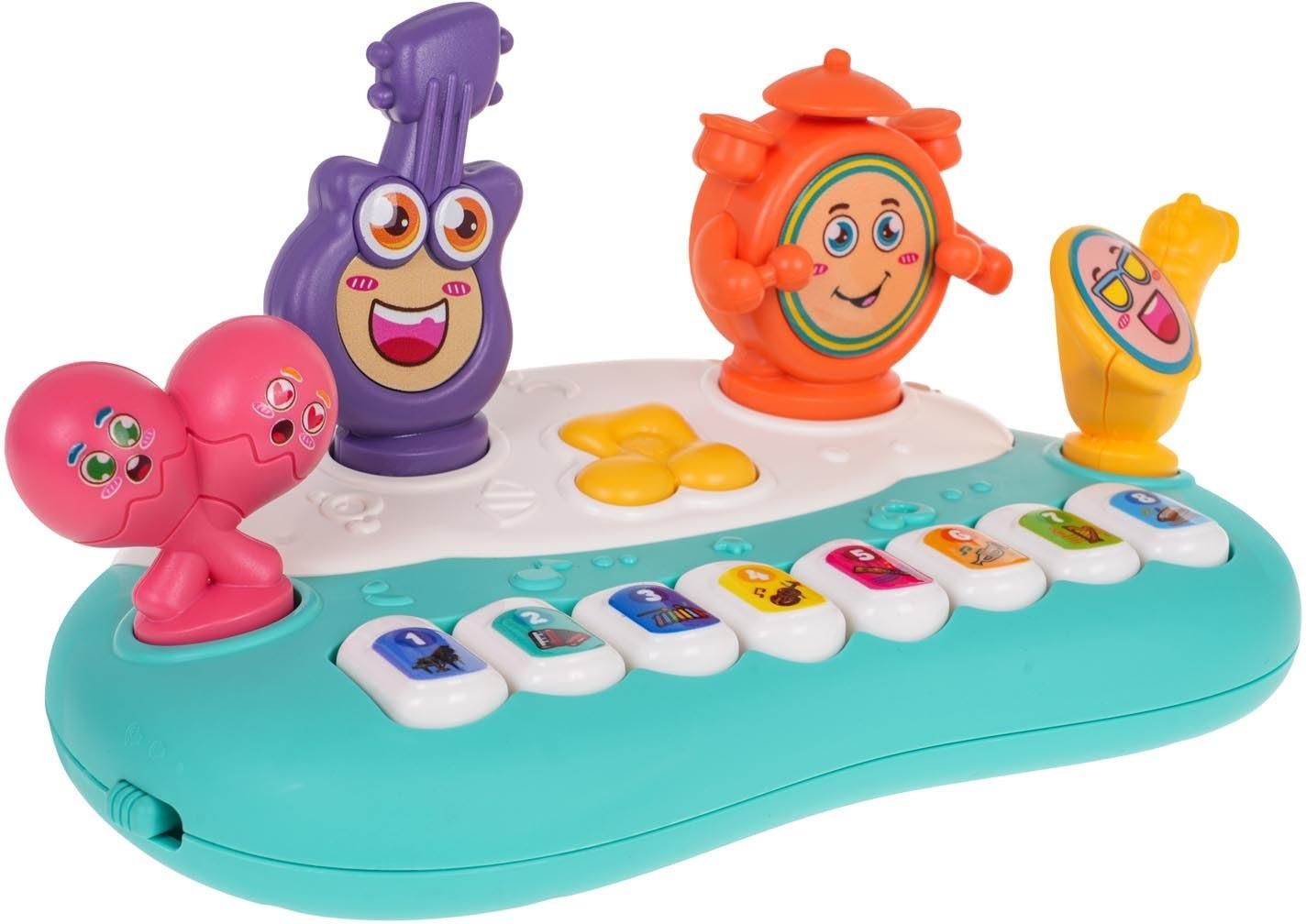 Opis Pianinko Dla Najmłodszych z Odgłosami Instrumentów Interaktywne pianinko z efektami dźwiękowymi i świetlnymi dla dzieci od 6-go miesiąca życia. Zabawka wykonana została z najlepszej jakości plastiku w żywych kolorach przyciągających wzrok dziecka. Jest bezpieczna dla maluchów, nie posiada ostrych krawędzi. Wesołe pianinko zasilane jest bateriami typu 3 x AAA 1,5 V (brak w zestawie). Posiada regulację głośności oraz efekty dźwiękowe i świetlne. Po naciśnięciu przycisku z nutką usłyszymy muzykę, a przycisk się podświetli. Każdy z ośmiu klawiszy pianinka, generuje inne dźwięki instrumentów i migotanie przycisku z nutką. Funkcje zabawki przeznaczona dla dzieci od 6-go miesiąca życia, wykonana z najlepszej jakości plastiku w żywych kolorach, bezpieczna dla dzieci, nie posiada ostrych krawędzi, efekty dźwiękowe: odgłosy ośmiu różnych instrumentów, muzyka z brzmieniem 4 instrumentów, efekty świetlne: podświetlenie przycisku z nutką, regulacja głośności. Wymiary - pianinko ok. 18 cm x 10,5 cm x 9,5 cm, - opakowanie ok. 22,5 cm x 12 cm x 13 cm. Zawartość zestawu - pianinko dla najmłodszych