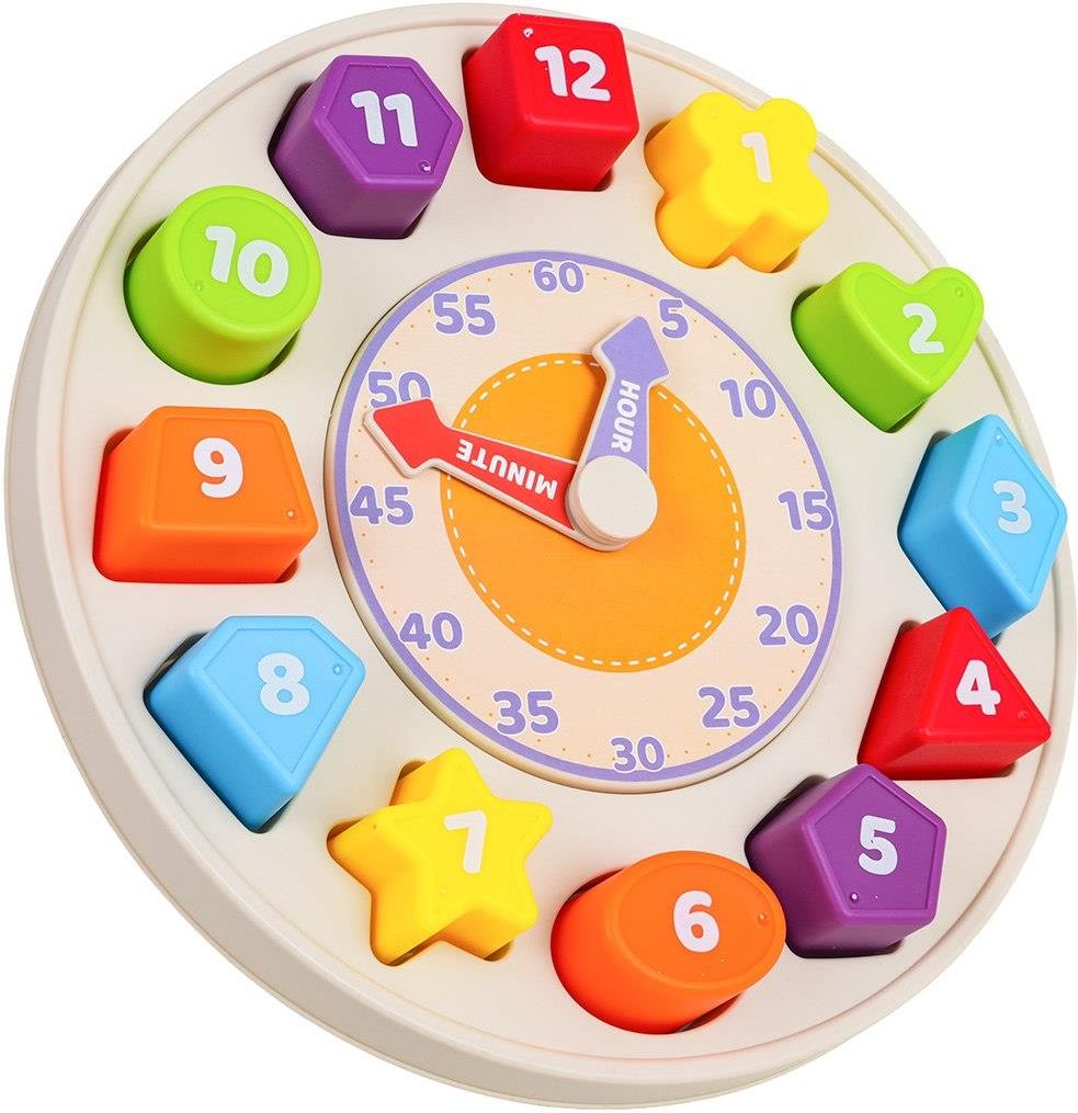 Opis Zegar dla Najmłodszych Różne Kształty Edukacyjny zegar z sorterem kształtów dla najmłodszych od dwunastego miesiąca życia. Zestaw wykonany został z bezpiecznych materiałów w żywych kolorach. Na tarczy zegara znaleźć możemy ruchome wskazówki oraz numerki od 5 do 60. Po zewnętrznej stronie tarczy znajduje się sorter kształtów. We wgłębieniach o różnych kształtach maluszek może umieścić aż 12 klocków. Każdy klocuszek oznaczony jest numerem od 1 do 12. Dzięki temu zestawowi, przez zabawę, maluszek oswoi się z zegarem, nauczy rozpoznawać minuty i godziny, pozna różne kształty i kolory. Funkcje: odpowiedni dla dzieci już od dwunastego miesiąca życia, wykonany z bezpiecznych materiałów, żywe kolory zachęcają do zabawy, uczy rozpoznawać minuty, godziny, kształty, kolory, ćwiczy rączki maluszka, stymuluje na wielu płaszczyznach, zegar można zawiesić na ścianie (zawieszka z tyłu). Wymiary - zegar ok. 26,5 cm x 5,5 cm, - opakowanie ok. 27,5 cm x 27,5 cm x 6,5 cm. Zawartość zestawu - zegar do nauki czasu i sorter kształtów