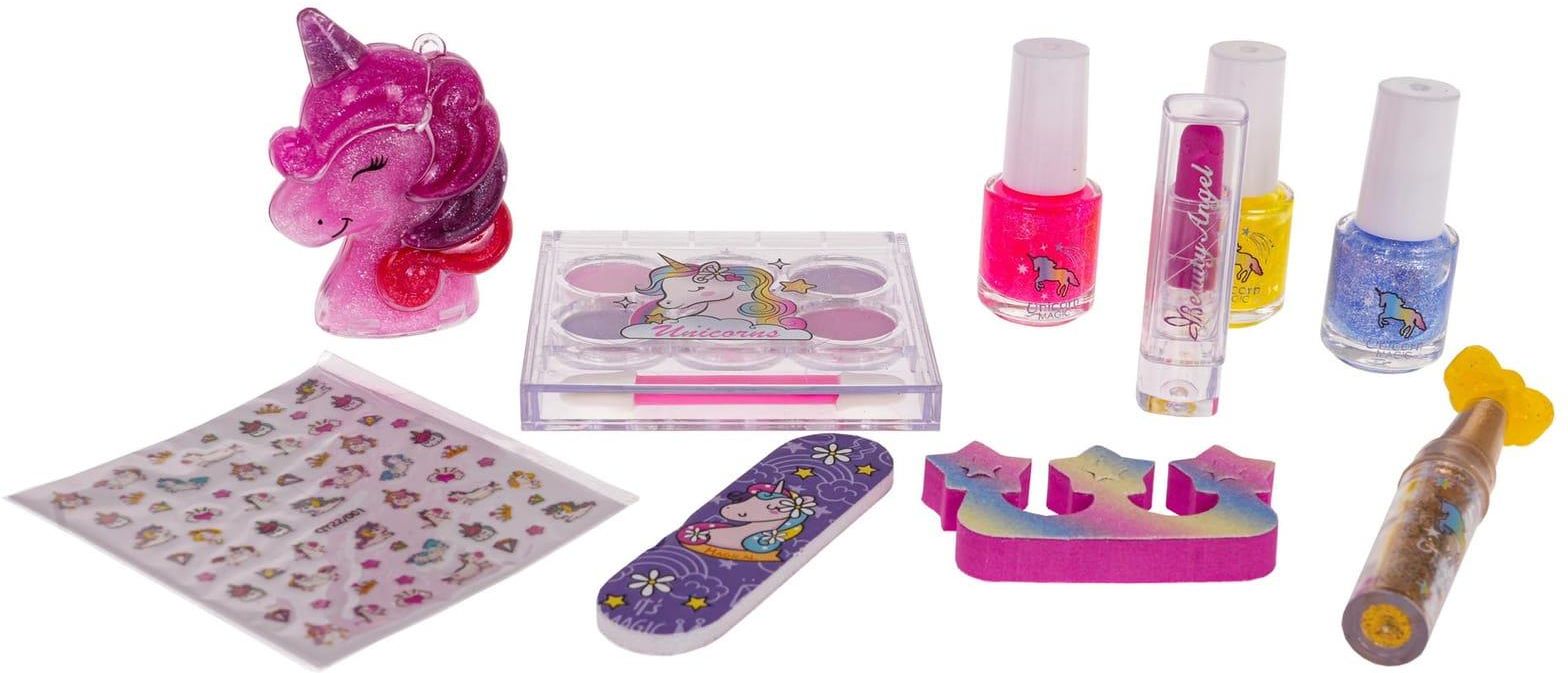 Opis Zestaw Do Robienia Paznokci Jednorożec Zestaw do malowania paznokci i twarzy z jednorożcem dla dzieci od 3-go roku życia. W zestawie znajdują się 3 brokatowe lakiery do paznokci, szminka, aplikator z brokatem, pilnik do paznokci, separator do stóp, cienie do powiek z pędzelkiem, błyszczyk do ust w pudełeczku o kształcie jednorożca oraz naklejki na paznokcie. Wszystkie kosmetyki są bezpieczne dla dziecka i łatwo się je zmywa. Funkcje zestawu odpowiedni dla dzieci powyżej 3-go roku życia, bezpieczny dla dzieci, antyalergiczny, bogato wyposażony. Wymiary lakiery ok. 5,5 cm x 2,5 cm, pilnik ok. 7 cm x 2 cm x 0,4 cm, zestaw cieni ok. 7 cm x 7,5 cm x 1 cm, pojemniczek w kształcie jednorożca z błyszczykiem ok. 6,5 cm x 4,5 cm x 2,5 cm, szminka ok. 5,3 cm x 1,3 cm, aplikator do brokatu ok. 9 cm x 2 cm x 1,5 cm, opakowanie ok. 28 cm x 24 cm x 4 cm. Zawartość zestawu cienie do powiek 6 sztuk w różnych kolorach, pędzelek do cieni, naklejki dekoracyjne na paznokcie, 3 x brokatowy lakier, błyszczyk do ust w pudełku o kształcie jednorożca, szminka, aplikator z brokatem, pilnik do paznokci z jednorożcem, separator do palców.