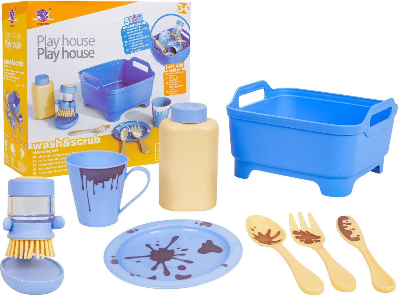 Opis Zestaw Sprzątający + Akcesoria Niebieski Kuchenny zestaw z akcesoriami zmieniającymi kolor dla dzieci od trzeciego roku życia. W zestawie znajduje się miska, butelka na płyn do mycia naczyń, szczotka oraz brudne sztućce, talerz i kubek. Wystarczy zalać wszystko ciepłą wodą i dzieje się magia, brud znika. Zestaw wykonano z dbałością o szczegóły z bezpiecznych dla dziecka materiałów. Funkcje: dla dzieci od trzeciego roku życia, wykonany z bezpiecznych dla dzieci materiałów, brud (farba) z naczyń i sztućców znika po dodaniu ciepłej wody. Wymiary miska ok. 17 cm x 17 cm x 9,5 cm, sztućce ok. 11,5 cm długości, butelka na płyn ok. 10 cm x 5,5 cm, kubek ok. 5,5 cm x 5 cm, talerz ok. 9,5 cm średnica, szczotka na stojaku ok. 9 cm x 6,5 cm x 5 cm, opakowanie ok. 27,3 cm x 10 cm x 24,5 cm. Zawartość zestawu miska do mycia, butelka na płyn do mycia naczyń, szczotka do mycia naczyń, sztućce: nóż, widelec, łyżka, talerz, kubek.