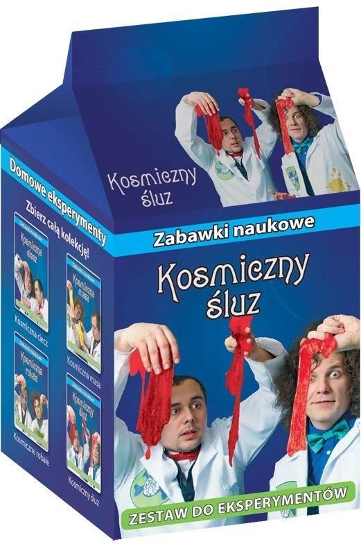 „Kosmiczny śluz” to tajny eksperyment Laboratorium szalonych naukowców. Jeszcze żadne dziecko nie oparło się tej cudownej, a jednocześnie straszliwej substancji… Jak ze specjalnych składników zrobić kolorowy śluz do odważnych domowych eksperymentów? Zdradzimy ci tę najbardziej skrywaną tajemnicę! ZAWARTOŚĆ: – alkohol poliwinylowy – boraks – barwnik spożywczy – 2 kubeczki – miarka – drewniany kijek – łyżka – instrukcja WIEK: 8+ WYMIARY: 8 x 8 x 15cm UWAGA: Zabawka nieodpowiednia dla dzieci poniżej 3-go roku życia. Ryzyko połknięcia małych elementów.