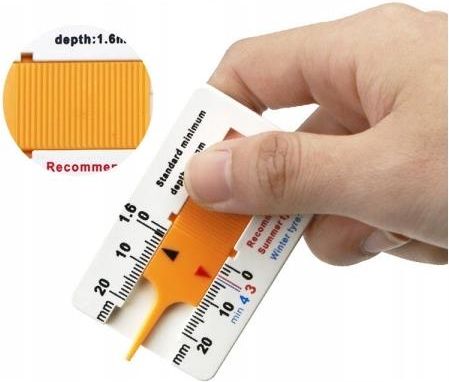 Prosty miernik głębokości bieżnika opon Niezbędny w każdym warsztacie samochodowym, wulkanizacji, a także przydomowym garażu. Nieodzowny przy ocenie / pomiarze zużycia opon. Prosta budowa sprawia, że pomiar jest niezwykle łatwy w wykonaniu. Dzięki czytelnej skali oraz antypoślizgowej powierzchni miarki wynik jest dokładny i wyraźnie widoczny. Rozmiary pozwolą mieć go zawsze przy sobie, brak baterii gwarantuje pełną gotowość w każdych warunkach, a szybka i prosta obsługa sprawia, że z pomiarem poradzi sobie każda osoba. Urządzenia możemy używać w zakresie 0 - 20 mm z dokładnością do 1 mm. Specyfikacja Zakres pomiaru: 0 - 20 mm Dokładność pomiaru: +/- 1 mm Jednostki pomiaru: milimetry Materiał: ABS Waga: 10 g Wymiary: 65 x 43 x 5 mm Głębokość bieżnika ma realny wpływ na ilość odprowadzanej spod kół wody/śniegu dlatego przyjmuje się, że minimalna bezpieczna wysokość bieżnika dla opon letnich to 3 mm, a dla zimowych 4 mm. Zadbaj o bezpieczeństwo Zgodnie z rozporządzeniem ministra infrastruktury z 2003 r. w sprawie warunków technicznych pojazdów i zakresu ich wyposażenia, najniższa dopuszczalna wysokość bieżnika wynosi 1,6 mm dla samochodów osobowych oraz 3 mm dla autobusów.
