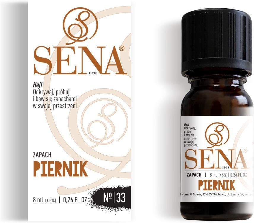 Markowe olejki zapachowe Idealne do odświeżania powietrza w pomieszcze-niach i samochodach. Zaleca się aplikację olejków za pomocą nawilżaczy powietrza,kominków ceramicznych, odkurzaczy (za wyjątkiem wodnych), w szafach, koszach. 100% VEGAN Opakowanie podlega recyklingowi Nietestowane na zwierzętach Węch to bardzo ważny zmysł. Przyjemny, kojący zapach idealnie trafiony w nasze gusta potrafi wprowadzić w dobry nastrój, przywołać najmilsze wspomnienia, a także zrelaksować, odprężyć i choć na chwilę zapomnieć o troskach dnia codziennego. Dlatego oferujemy najwyższej jakości olejki zapachowe na bazie naturalnych olejków eterycznych. Przy ich pomocy wprowadzisz do wnętrza klimatyczny i miły nastrój. ZAPACH PIERNIKA Zapach piernika nierozerwalnie kojarzy się ze Świętami Bożego Narodzenia. Korzenne przyprawy, grzane wino i piernik to przepis na idealny zimowy wieczór. Aby lepiej wczuć się w świąteczną atmosferę, można użyć olejku Sena o zapachu piernika. Kompozycja zapachowa idealnie komponuje się z kuchennymi przygotowani do świętowania. Olejek można stosować w dyfuzorach, odświeżaczach powietrza bądź nasączenia potpourri czy suszu kwiatowego. Zapach delikatnie rozchodzi się po całym domu i razem z igliwiem z drzewka tworzy niepowtarzalną atmosferę. Dostępne jest szeroki wybór olejków zapachowych Aloes Antytabak Arbuz Bez Brzoskwinia Bawełna Bukiet Kwiatowy Cynamon Cytronelowy Cytryna Drzewo Sandałowe Eukaliptus Exotic Fiołek Frezja Goździk Grejpfrut Herbata Zielona Jabłko Jaśmin Kamasutra Kawa Kiwi Konwalia Kwiat Lipy Las Lawenda Lilia Łąka Magnolia Malina Melisa Mięta Morski Nowe Auto Ocean Opium Orange Orchidea Orient Paczula Piżmo Rozmaryn Róża Truskawka Wanilia Wiosna Zielony Las Akacja Ananas Avokado Bambus Bergamotka Biały pieprz Cappuccino Cedr Cyklamen Cyprys Czekolada Rajska plaża Drewno tekowe Drzewo kaszmirowe Gardenia Geranium Granat Guawa Hiacynt Irys Jodła Kamfora Kwiat Wiśni Limonka Lotos Lychee Maciejka Mango Marakesz Marakuja Melon Migdał Mirra Nagietek Narcyz Niezapominajka Owoce leśne Papaja Passiflora Piernik Piwonia Puder Relaksacyjny Skórzany Tuberoza Wrzos Ylang Ylang Żurawina