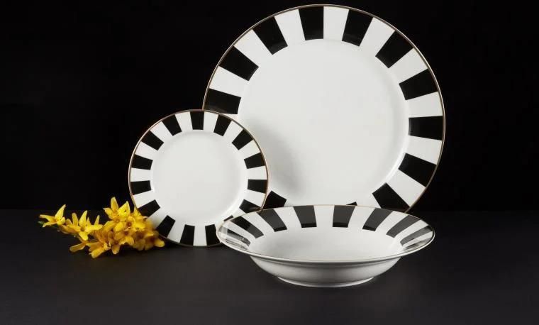 Serwis obiadowy 18-elementowy Ambition Ribs 52703 Informacje o produkcie: – Waga [kg]: 7 – Ilość osób: 6 – Materiał: Porcelana – Kolor: biały, czarny, złoty – Wzór: pasy – 18 elementów – 6 talerzy obiadowych, 6 głębokich, 6 deserowych