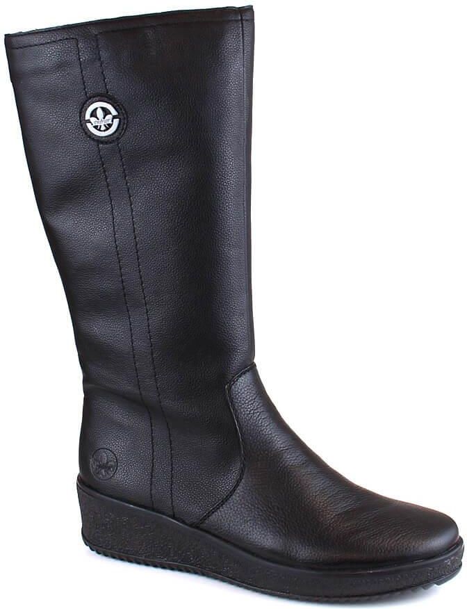 Skórzane wodoodporne kozaki ocieplane owczą wełną Rieker W RKR237B Właściwości Komfortowe buty niemieckiego producenta RIEKER posiadają membranę riekerTEX, która zapewnia wzmożoną odporność na przemakanie, ochronę przed zimnem wilgocią, swobodne oddychanie. Po odsunięciu zamka w tylnej części cholewki buty zwiększają swoją szerokość Kolor czarny