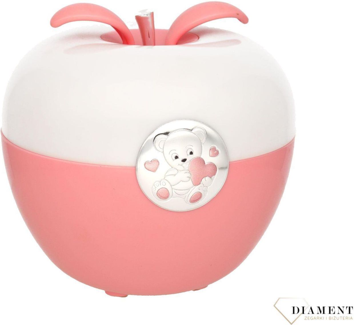Dziecięca lampka nocna Jabłuszko VL21150R – idealna lampka do pokoju dziecka OUTLET – Dziecięca lampka nocna Jabłuszko VL21150R ze srebrnym emblematem misia Uwaga: produkt OUTLET – lampka posiada przebarwienia widoczne na kolejnych zdjęciach. Wada ma charakter wyłącznie estetyczny i nie wpływa na działanie lampki. Lampka nocna Jabłuszko VL21150R to uroczy dodatek do każdego pokoju dziecięcego. Wyróżnia się oryginalnym kształtem jabłuszka oraz okrągłym emblematem z wizerunkiem misia pluszowego, wykonanym z wysokiej jakości metalu pokrytego srebrem i zabezpieczonym specjalnym lakierem ochronnym. Dzięki temu emblemat zachowuje swój piękny wygląd przez długi czas. Lampka emituje ciepłe, delikatne światło, które tworzy przytulną atmosferę, sprzyjającą zasypianiu. Dodatkową atrakcją jest możliwość włączenia kolorowych świateł, które przypadną do gustu najmłodszym. Produkt jest kontrolowany nadmuchem, co sprawia, że jego obsługa jest nie tylko łatwa, ale i zabawna dla dziecka. W zestawie znajduje się kabel USB o długości 1 metra, który pozwala na wygodne podłączenie lampki do dowolnego portu USB. Główne cechy produktu: Uroczy design w kształcie jabłka z srebrnym emblematem misia Idealny prezent na chrzest, urodziny lub baby shower Wysokiej jakości materiały: metal pokryty srebrem i lakierem ochronnym Delikatne światło w ciepłym odcieniu + tryb kolorowych barw Średnica: 12 cm, wysokość: 11 cm Oryginalne opakowanie, 2-letnia gwarancja Produkt dostępny w autoryzowanym sklepie z dewocjonaliami i pamiątkami na chrzest Dlaczego warto wybrać lampkę Jabłuszko VL21150R? Ta dziecięca lampka nocna ze srebrnym emblematem to nie tylko praktyczne źródło światła, ale także elegancka pamiątka chrztu lub narodzin dziecka. Dzięki swojej funkcjonalności i estetyce świetnie sprawdzi się zarówno jako element wystroju pokoju, jak i wyjątkowy prezent dla noworodka. Diament jest autoryzowanym sprzedawcą najwyższej jakości dewocjonaliów w Polsce. Cała kolekcja pamiątek dla dzieci zakupiona w naszym sklepie posiada 2 letnią gwarancję i zapakowane są w oryginalne opakowanie.