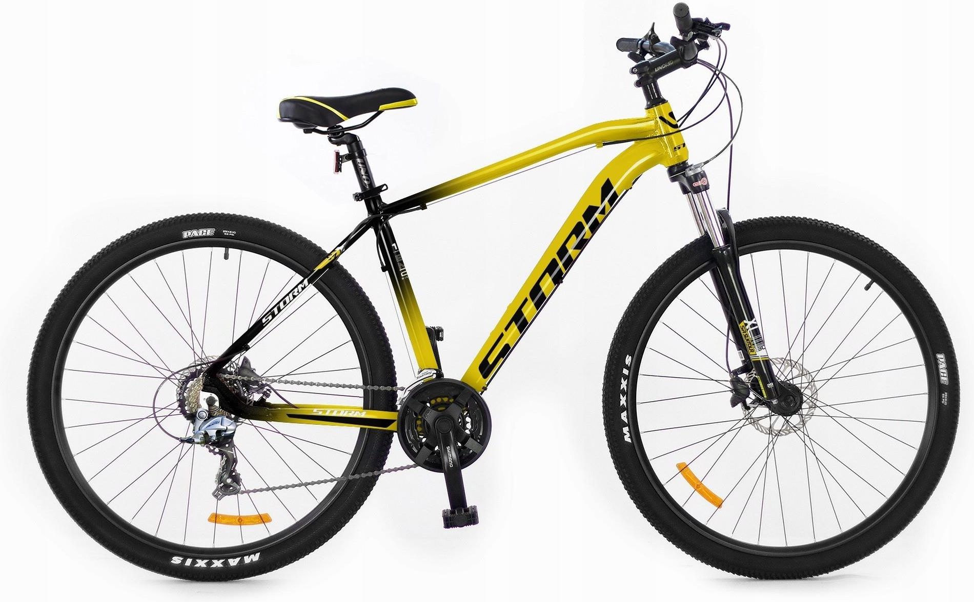 Storm Shark 5.0 Man Żółty/Czarny 29 2023 Model Storm Shark 5.0 Man w energetycznym połączeniu żółtego i czarnego koloru to idealny wybór dla mężczyzn poszukujących roweru górskiego, który sprawdzi się w różnorodnych warunkach. Ten jednoślad został zaprojektowany z myślą o intensywnym użytkowaniu, co czyni go doskonałym towarzyszem na szlakach, w lesie czy na miejskich ulicach. Dzięki nowoczesnym materiałom i solidnej konstrukcji, ten rower zapewnia nie tylko estetyczny wygląd, ale również wysoką funkcjonalność. Specyfikacja techniczna Przyjrzyjmy się teraz najważniejszym parametrom technicznym, które definiują ten model. Specyfikacja roweru górskiego Storm Shark 5.0 Man obejmuje szereg istotnych elementów, które wpływają na jego wydajność oraz komfort jazdy: Materiał ramy: aluminium T6101, lekkie i trwałe, Liczba biegów: 24 biegi, umożliwiające płynne przełączanie w różnych warunkach, Hamulce: tarczowe hydrauliczne Shimano MT-200, zapewniające efektywne hamowanie, Amortyzacja: widelec Suntour XCM o skoku 100 mm, poprawiający komfort na nierównościach, Przerzutki: Shimano (przednia Altus FD-M310 i tylna Alivio RD-T4000) dla precyzyjnych zmian. Wymiary i waga Rowery górskie muszą łączyć w sobie stabilność z mobilnością. Storm Shark 5.0 Man jest dostępny w rozmiarze ramy 19 cali, co czyni go wszechstronnym modelem, a duże koła o średnicy 29 cali zapewniają doskonałą stabilność. Waga modelu wynosi 12 kg, co czyni go stosunkowo lekkim dla roweru górskiego, co ułatwia transport oraz manewrowanie w miejskich warunkach. Dzięki niskiej wadze, jego użytkownicy zyskują również większą zwrotność, co przekłada się na łatwiejsze pokonywanie przeszkód w terenie. Typ roweru Rower górski jest doskonałą propozycją dla tych, którzy szukają pojazdu do aktywnej jazdy w terenie. Ten typ jednośladu skierowany jest do szerokiego grona użytkowników – od niedoświadczonych amatorów po bardziej zaawansowanych rowerzystów. Dzięki swojej konstrukcji i wytrzymałym komponentom, Storm Shark 5.0 Man sprawdzi się zarówno na szlakach, w lesie, jak i na miejskich drogach. Jego zdolność do pokonywania trudnych warunków terenowych czyni go wszechstronnym wyborem dla każdego miłośnika jazdy na dwóch kółkach. Komfort i wyposażenie Komfort jazdy jest kluczowy, zwłaszcza podczas długich tras, dlatego model Storm Shark 5.0 Man został wyposażony w siodło marki Storm, które zapewnia wygodę nawet na długich dystansach. Wspornik siodła z aluminium o średnicy 30,9 mm oraz kierownica o szerokości 720 mm w połączeniu z ergonomicznymi chwytami Herrmans pozwalają na dostosowanie pozycji do indywidualnych preferencji rowerzysty. Choć ten model nie jest wyposażony w bagażnik ani błotniki, to minimalistyczna budowa przyczynia się do obniżenia wagi i zwiększenia zwrotności. Zastosowanie opon Maxxis Pace 29x2,1 gwarantuje doskonałą przyczepność, co jest szczególnie ważne w trudnym terenie. Kluczowe cechy roweru Storm Shark 5.0 Man Oto najważniejsze cechy, które sprawiają, że ten rower jest idealnym wyborem dla entuzjastów jazdy: Materiał ramy: lekka, ale wytrzymała konstrukcja z aluminium T6101, co zapewnia długotrwałość, Hamulce: tarczowe hydrauliczne Shimano MT-200, które zapewniają efektywne hamowanie w różnych warunkach, Przerzutki: precyzyjne zmiany biegów dzięki systemowi Shimano (24 biegi), co zwiększa wszechstronność jazdy, Amortyzacja: doskonały widelec Suntour XCM z 100 mm skoku, który poprawia komfort jazdy na nierównych nawierzchniach, Komfort: ergonomiczne siodło i chwyt kierownicy, co wpływa na wygodę jazdy podczas długich tras.