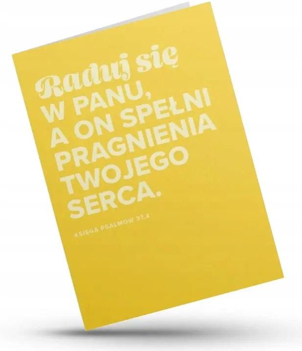 „Raduj się w Panu, a On spełni pragnienia twojego serca”.Radosna kartka w słonecznym kolorze z cytatem z Psalmu 37,4.Świetny wybór, by przekazać słowa zachęty, wdzięczności lub życzenia pełne nadziei.Wewnątrz znajduje się miejsce na własny tekst lub życzenia, dzięki czemu kartka nabiera osobistego charakteru. Do kompletu dołączona jest dopasowana koperta w kolorze pasującym do projektu.Wymiary: 11.2 x 15.8 cm