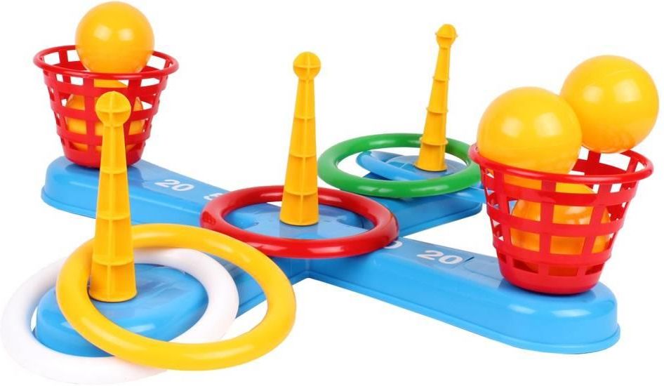 Zestaw zawiera Zawiera 2 panele bazowe, 5 prętów, 5 pierścieni w różnych kolorach. 5 koszyczków, 5 piłeczek Wymiary 46,5 x 15,5 x 13,5 cm. Gra zręcznościowa rzut pierścieniem i piłeczką Jak grać Przed rozpoczęciem gry należy złożyć podstawę w kształcie krzyża włożyć pręty lub koszyczki, na które pierścienie lub piłeczki są wrzucane. Każdy pręt ma numery (10,20,30,50). Jest to liczba punktów, które gracz zbiera, rzucając pierścień na odpowiedni pręt. Zwycięzcą jest ten, który zdobędzie najwięcej punktów. Gra zręcznościowa rzut pierścieniem i piłeczką przeznaczony jest dla każdego dziecka 3+ Świetnie sprawdza się podczas zabaw na świeżym powietrzu oraz w domu. Wysoka jakość wykonania. Bezpieczna dla dzieci. Wzbudza ciekawość. Uczy precyzji i koncentracji. Angażuje w gry zespołowe oraz rozwija umiejętności emocjonalne i społeczne. Wymarzony prezent dla każdego dziecka 3 +