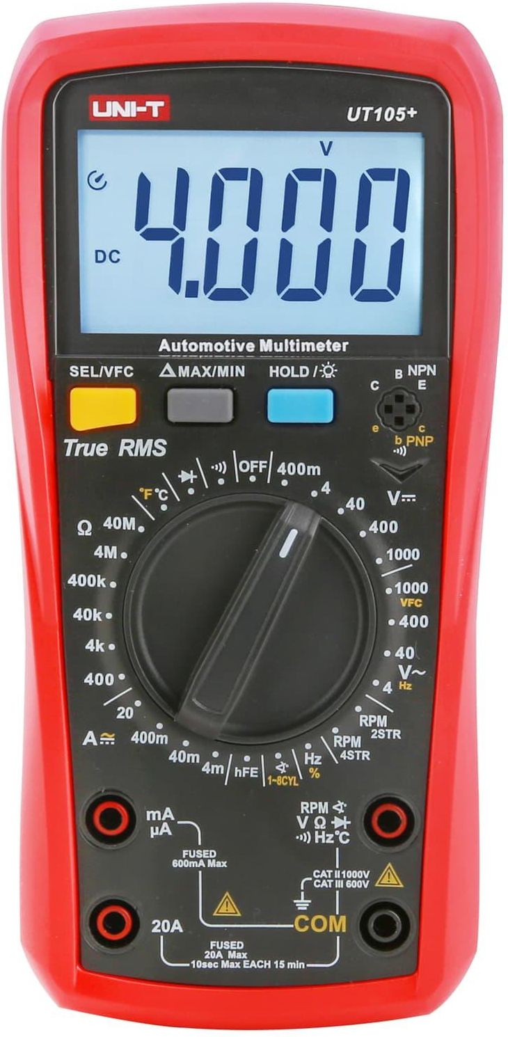Miernik multimetr uniwersalny Uni-T UT105+ True RMS ZAKRESY POMIAROWE Napięcie stałe DC: 400 mV/4 V/40 V/400 V/1000 V; ±(0,5%+3) Napięcie zmienne AC: 4 V/40 V/400 V/1000 V; ±(0,8%+3) Natężenie prądu stałego DC: 4 mA/40 mA/400 mA/10 A; ±(1%+8) Natężenie prądu zmiennego AC: 4 mA/40 mA/400 mA/10 A; …