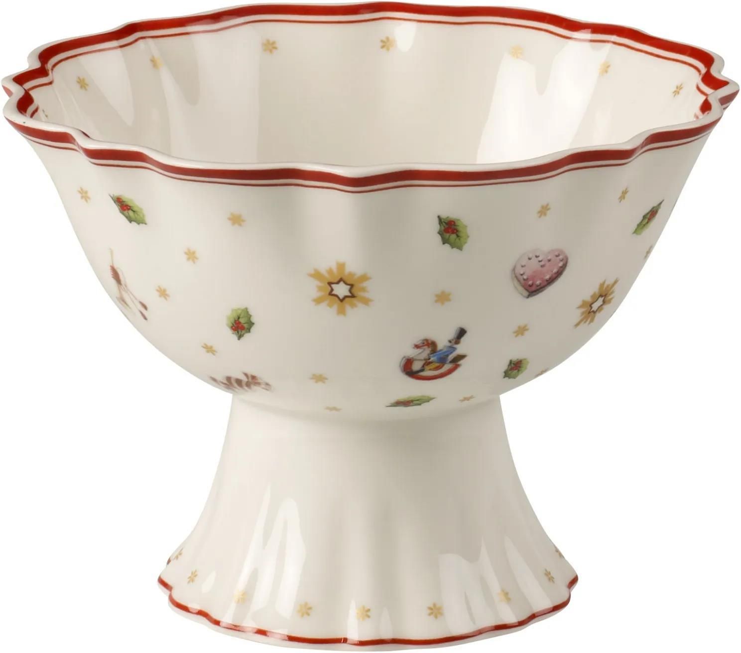 Misa na nóżce Toy’s Delight marki Villeroy&Boch o średnicy 15cm to idealny pomysł na serwowanie świątecznych przysmaków – aromatycznych pierników, orzechów czy suszonych owoców. Niebanalną miseczkę zdobią świąteczne motywy tj. Święty Mikołaj, choinka, koń na biegunach, dziadek do orzechów czy wreszcie kolorowe pierniczki. Zastawa utrzymana w tradycyjnych barwach: czerwonym, białym oraz zielonym kolorze pozwoli wprowadzić na każdy stół nostalgiczną atmosferę, dzięki której celebrowanie Świąt Bożego Narodzenia nabierze wyjątkowego charakteru. Zaleca się ręczne mycie produktu.