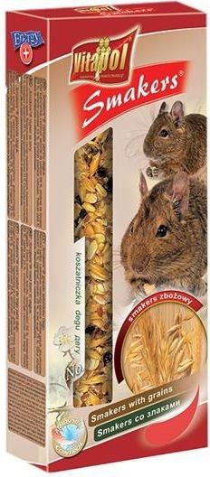 Smakers Snack zbożowy dla koszatniczki 2 szt 90 g Smakersy od Vitapolu są przekąskami o indywidualnych składach, które zostały opracowane dla każdego gatunku gryzoni i królika. Naturalne składniki tych smakowitych kolb nie tylko uzupełniają codzienną dietę zwierzęcia o niezbędne składniki …