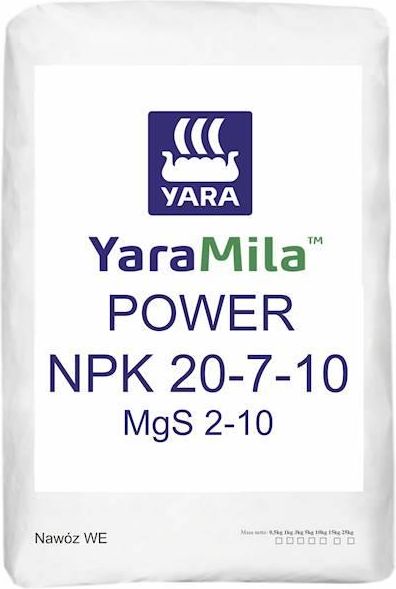 Yara Mila Power 20-7-10 3kg Zalety produktu: -zawartość dwóch form azotu, azotanowej i amonowej, których połączenie wpływa na optymalne wykorzystanie azotu -około 25% fosforu w formie polifosforanów, które w połączeniu z tradycyjnymi ortofosforanami stanowią idealną kompozycję dostępnego dla roślin fosforu, tak potrzebnego m.in. do wiosennej regeneracji ozimin -potas całkowicie rozpuszczalny w wodzie -doskonałe właściwości fizyczne (twardość, ciężar nasypowy, wyrównanie granul) wpływające na równomierny wysiew -dostarczamy pierwszą, wczesnowiosenną dawkę azotu, a wraz z nią efektywny fosfor oraz potas -zawartość siarki (10% SO3) wpływa na lepsze wykorzystanie azotu -zawiera dodatkowo 2% MgO