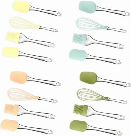 ZESTAW PRZYBORÓW SILIKONOWYCH 4-ele 4 KOLORY MAESTRO MR-1590Przybory wykonane z akrylu i silikonu.Bardzo przydatny podczas prac kuchennych i cukierniczych.W zestawie znajduje się trzepaczka, pędzelek, łopatka i szpatułka.Bezpieczne do stosowania we wszystkich rodzajach naczyń z powłokami nieprzywierającymi.Ergonomiczny, antypoślizgowy uchwyt zapewnia wygodną i bezpieczną pracę.Uchwyty przyborów wyposażone w otwory do zawieszania.Silikon nie wchłania zapachów, a także nie nasiąka płynami.Łatwe do utrzymania w czystości. Wymiary:Trzepaczka: 30 x 17 x 6.5cmPędzelek: 22 x 5cm Łopatka: 25.5 x 9.2 x 6.5cmSzpatułka: 25 x 8.5 x 5.5cmZestawy występują w 4 kolorach:* ŻÓŁTY* TURKUSOWY* BRZOSKWINIOWY* ZIELONY