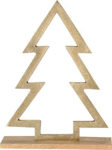 Metalowa choinka dekoracja bożonarodzeniowa w kolorze złotym 21 cm Z naszą dekoracją przygotujesz dom na okres świąt Bożego Narodzenia. Lekka aluminiowa konstrukcja tworzy kształt choinki, którą możesz ustawić dosłownie wszędzie: na półce, stole, oknie itp. bez względu na to czy masz urządzony dom z stylu nowoczesnym, klasycznym czy glamour. Specyfikacja: materiał: aluminium,drewno wymiary: 16,5 x 6 x 21,5 cm, waga: 160 g, kolor: złoty.