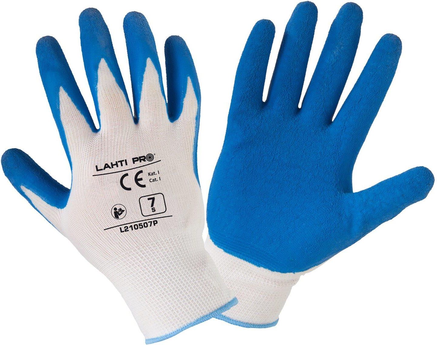 Rękawice ochronne powlekane lateksem 12 par rozm.9 firmy Lahti Pro. Cechy: - wykonane z poliestru - lateks o porowatej strukturze zwiększa odporność na przetarcia i rozdarcia oraz podwyższa przyczepność - rękawiczki zakończone ściągaczem Zastosowanie: Wykorzystywane przy podstawowych pracach magazynowych, w budownictwie, w gospodarstwie domowym.Zapewniają podstawową ochronę dłoni podczas prostych czynności.
