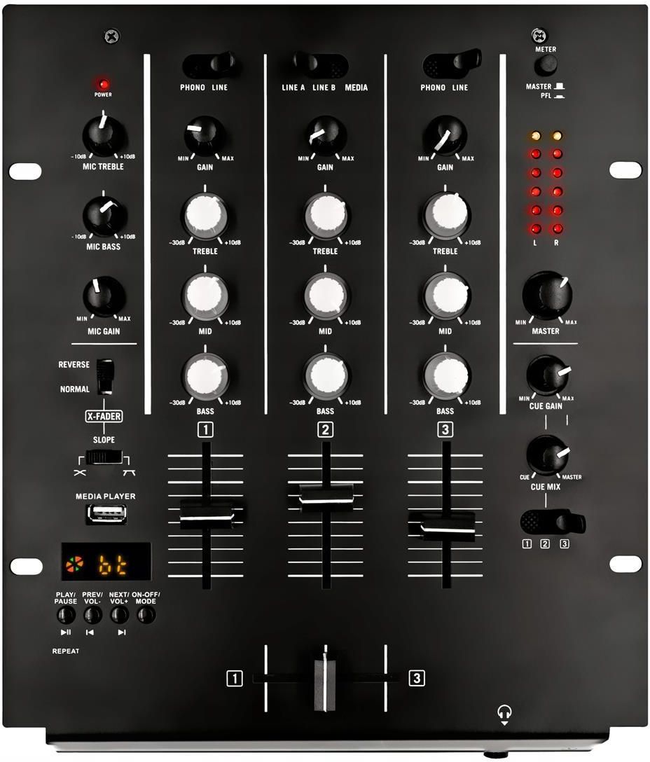 Mikser DJ audio MusicMate MM-DJ200 MixMaster Kolor: Czarny Gniazda wejściowe: 3x RCA L/P PHONO/LINE, Mikrofonowe Jack 6.3mm, USB typ A Gniazda wyjściowe: RCA L/P Master, RCA L/P Record, Słuchawkowe (Jack 6.3mm) Wyjście słuchawkowe: Tak Wejście mikrofonowe: Tak Szerokość [cm]: 24.5 Mikser DJ …