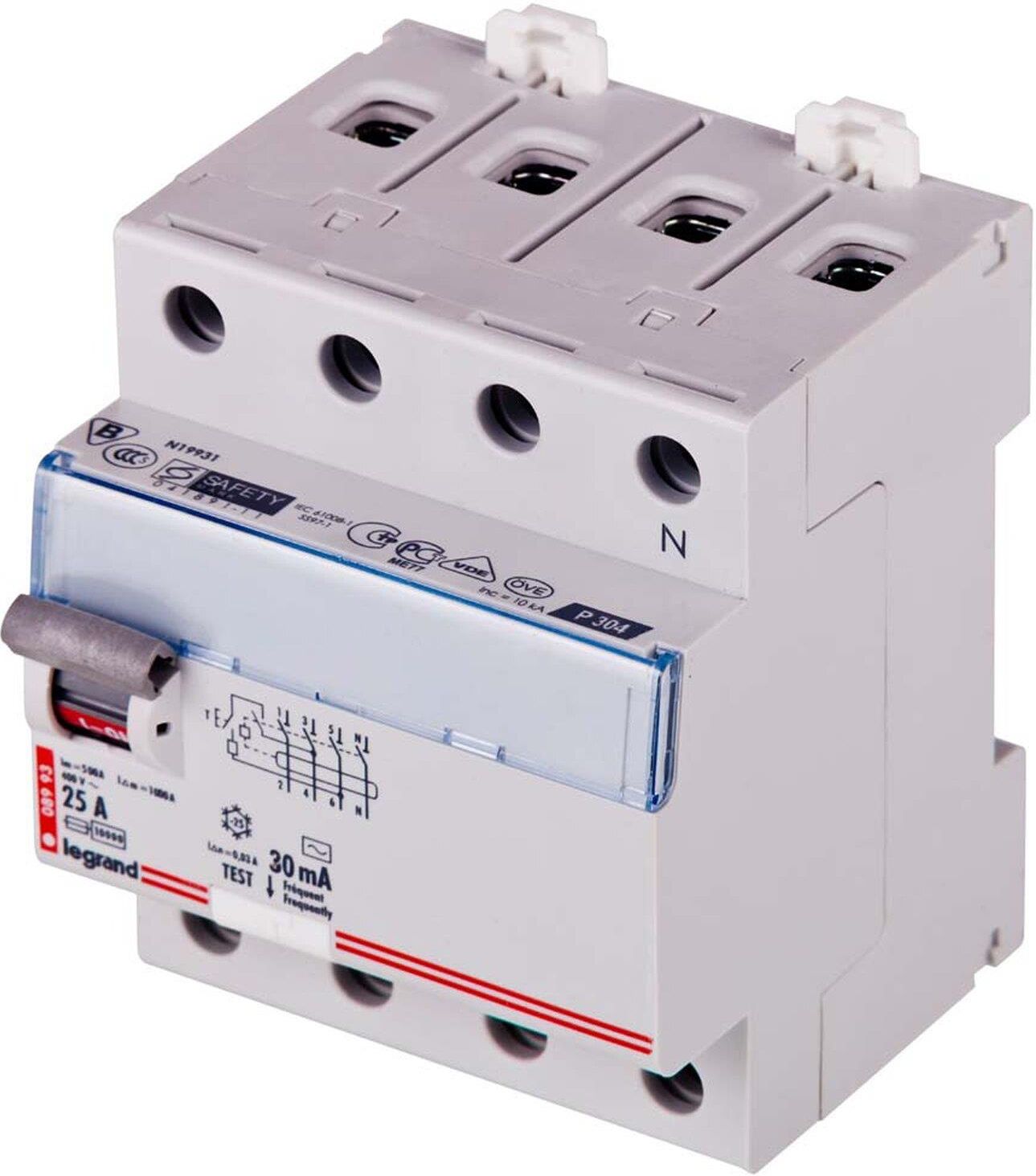 Wyłącznik różnicowo-prądowy czterobiegunowy P-304 25 A marki Legrand stosowany jest w instalacji elektrycznej do 1 kV. Służy do ochrony przed porażeniem prądem i do zabezpieczenia urządzeń przed uszkodzeniem.Wyłącznik ma klasę zwłoczności B. Znamionowy prąd różnicowy wynosi 30 mA, a prąd znamionowy 25 A. Biegun neutralny umieszczony jest po prawej stronie wyłącznika.Wyłącznik posiada przezroczyste okienko, w którym można zamieścić czytelny opis zabezpieczonego obwodu.Szerokość w modułach 17,5 mm: 4.