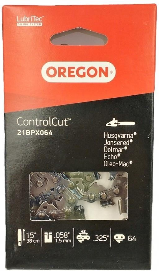 Łańcuch piły spalinowej ControlCutTM Oregon ControlCutTM to nowe łańcuchy wyprodukowane zarówno na potrzeby osób posiadających własne przydomowe ogrody jak i profesjonalistów pracujących pilarkami w lesie. Łańcuch ControlCutTM to idealne rozwiązanie również dla profesjonalistów zajmujących się cięciem drewna, poszukujących w pełni funkcjonalnego systemu cięcia, który zapewnia płynne cięcie i mniejszy odrzut (odbicie). Dzięki ControlCutTM nie musisz kupować dwóch różnych łańcuchów. Jeżeli jesteś użytkownikiem, który wykorzystuje pilarkę do cięcia drzewa przeznaczonego dla własnego użytku to jest to rozwiązanie idealne dla Ciebie. Stan - nowy Producent - OREGON Numer katalogowy - 21BPX064E Prowadnica - 15" / 38 cm Ilość ogniw łańcucha - 64 Skok łańcucha - 0.325" Szerokość rowka prowadnicy - 1,5 mm Nadający się do: Husqvarna: 36, 40, 42, 45, 51, 136, 154, 240, 242, 254, 257, 262, 339XP, 340, 345, 346, 346XP, 350, 353, 357, 357XP, 359, 435, 435E, 440E, 445, 445E, 450E, 455 RANCHER, 460 RANCHER, 460, 455E RANCHER, 41, 44, 50, 133, 137, 141, 142, 234, 238, 242XP, 246, 261, 351, T435, 444, 235, 560XP, 440, 550, 450, EL1400, EL1500, EL1600, Oleo-Mac: 938, 940, 941, 942, 942C, 945, 946, 947, 950 Super, 950A, 950, 951, 952, 956, 962, E300F, 850, Solo: 639, 641, 644, 645, 647, 650, 651, 652, 656, 665, Makita: DCS430, DCS460, DCS500, DCS5030, DCS520, DCS4300I, DCS5200I, DCS431, 45, DCS4600S, DCS5000, DCS43001, Jonsered: 370, 380, 410, 420, 425, 435, 45, 450, 451, 451EVS, 452, 455, 490, 49SP, 50, 51, 52, 510, 520, 521, 525, 535, 590, 2012, 2014, 2015, 2016, 2036, 2040, 2041, 2045, 2050, 2051, 2054, 2055, 2145, 2147, 2149, 2152, 2150, 2153, 2155, 2156, 2159, 2163, CS2149W, CS2152W, 2063, 2141, Dolmar: 109, 110, 111, 112, 113, 114, 115i, 116, PS460, PS4600, PS4605, PS500, PS5000, PS510, PS5100S, PS540, ES1800, Partner: 365, 400, 405, 410, 450, 460, 465, 495, 500, 510, 540, 545, P500, P5000, P5500, 470, Zenoah: G38, G415AVS, G410AVS, G455AVS, G46, G500AVS, G5300, G5000, Homelite: HCS4040, HCS4446CA, 250, 252, 290, 290C, 300, 340C, 3850B, 415B, 4550B, 4045, 340, 3850C, 444, Nac: SPS01-45, SPS02-45, SPS01-52, YD40, YD 40/45, YD52, NO-CS38, Echo: 4510, Shindaiwa: 451S, Przed dokonaniem zakupu prosimy o dokładne zweryfikowanie, jaki skok łańcucha posiada Państwa sprzęt. Najlepiej sprawdzić to, zliczając ilość zębów na koszu sprzęgła (7 zębów – skok 0,325, 6 zębów – skok 3/8). Jeśli kosz sprzęgła jest z zębatką pływającą informacja będzie zamieszczona na zębatce (0,325 lub 3/8). Ogniwo prowadzące łańcucha tnącego jest to ogniwo, które wchodzi i porusza się w rowku prowadnicy. Pomimo, że łańcuch tnący może odpowiadać modelowi Twojej pilarki, jego długość jest uzależniona od długości założonej prowadnicy. W celu dobrania łańcucha odpowiedniej długości: KONIECZNIE policz ilość ogniw prowadzących lub poszukaj specjalnych oznaczeń na prowadnicy - ilość ogniw oznaczana jest zazwyczaj cyfrą obok liter "DL" (z ang. Drive Links)