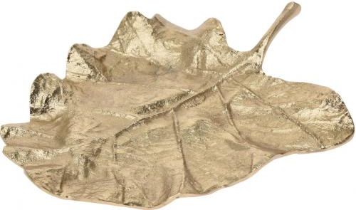 Patera w kolorze złota dekoracja Piękna srebrna patera o nieregularnych kształtach, to dekoracja od której ciężko oderwać wzrok. Wykonana z aluminium jest lekka i można postawić ją za równo na półce jak i na stole lub komodzie. Może służyć jako samodzielna ozdoba lub do ekspozycji np. owoców, ciastek itp. Idealny pomysł na prezent. Specyfikacja: wymiary: 34x27 cm, materiał: aluminium, kolor: złoty, waga 540 g.