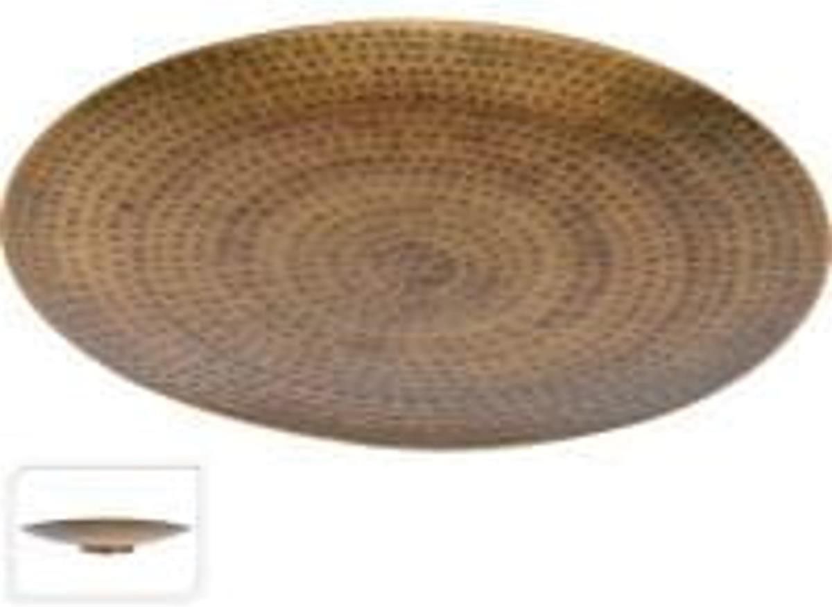 Talerz platerowany mosiądzem młotkowany 25 cm Ozdobny talerz, któremu nadano piękną chropowatą fakturę poprzez młotkowanie metalu. Można wyeksponować na nim owoce, słodycze itp. W każdym pomieszczeniu ten element dekoracyjny będzie wyglądał dobrze. Ciekawy pomysł na prezent. Specyfikacja: materiał: metal, średnica: 25 cm, kolor antyczny mosiądz.